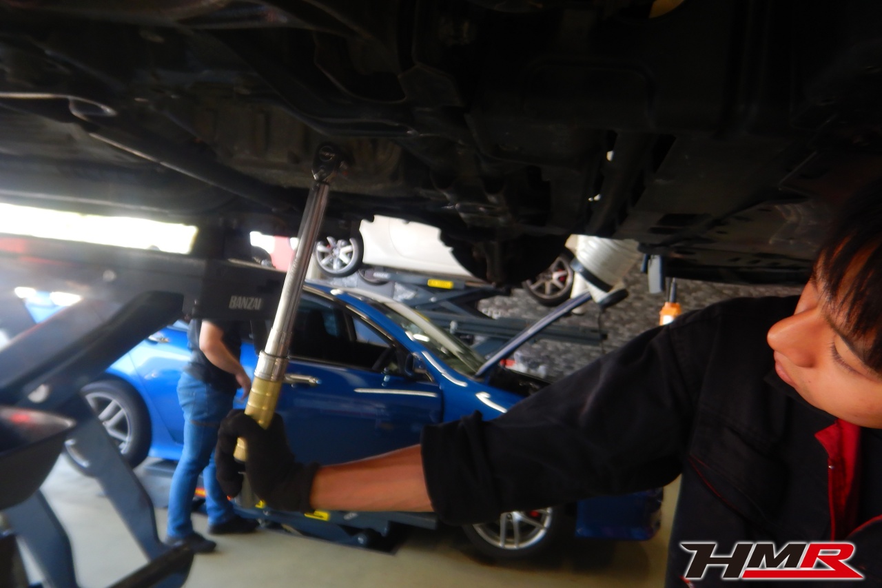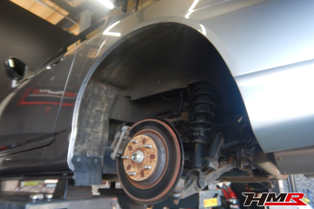 ハブベアリング・ボールジョイント、アーム・リンク類のガタ、ブッシュ・ブーツ類の劣化、エンジン・ミッション・デフからのオイル漏れと各マウント類、タイヤ溝の残量、空気圧の点検を行いました。前後左右スタビリンク交換、左右タイロッドエンドブーツ交換、左右フロントロアアームブーツ交換を行いました。