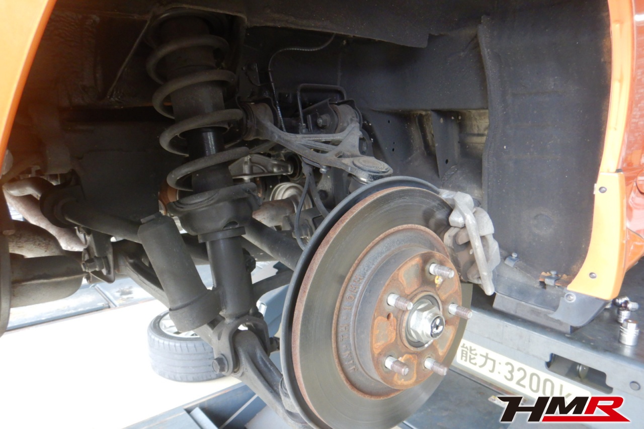 ハブベアリング・ボールジョイント、アーム・リンク類のガタ、ブッシュ・ブーツ類の劣化、エンジン・ミッション・デフからのオイル漏れと各マウント類、タイヤ溝の残量、空気圧の点検を行いました。特に問題ありませんでした。