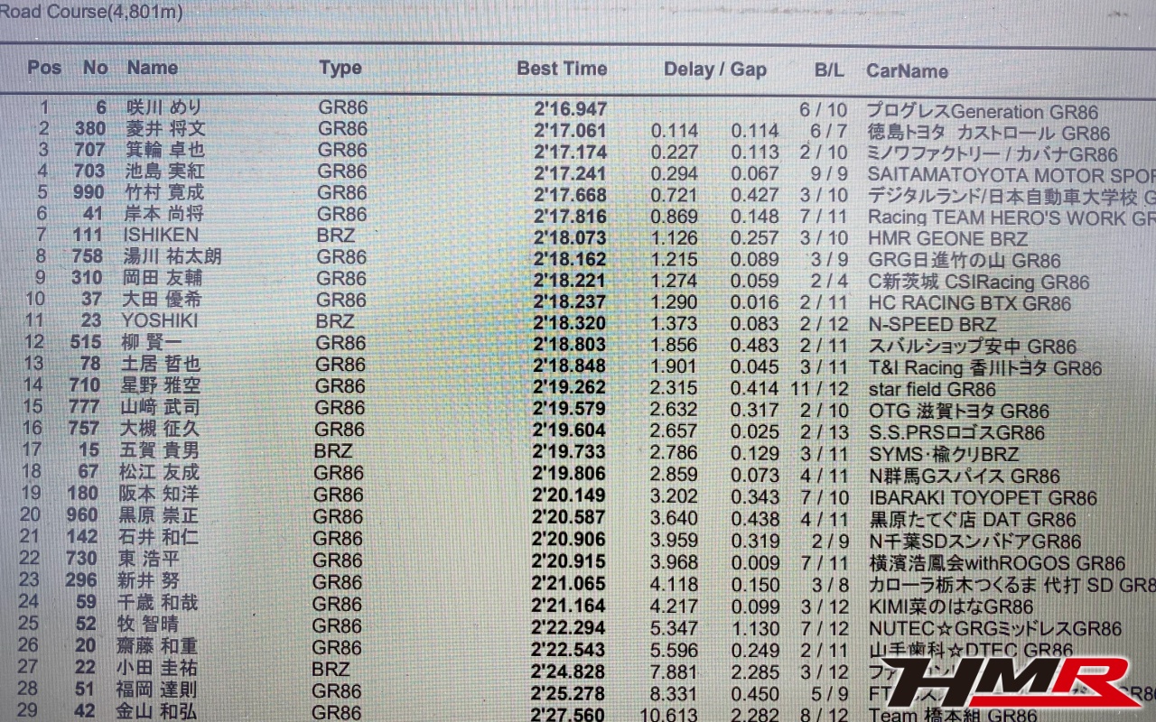 そんな感じで臨んだ予選。咲川さんの後ろについて引っ張ってもらい、コースイン1周目はしっかりとタイヤを暖めて、1ラップアタックに入りました。タイヤはいい感じに暖まっていて、感触はとてもいいフィーリング。前を走る咲川さんにも離されることはなく付いていけて、S字からヘアピンまでは逆に追いついている状況でした。そして記録したタイムは2分16秒889!セクター3は全体ベストを記録することもできました。A組予選では4番手。3位の選手とは0.005秒差。咲川さんとは0.088秒差という僅差でした。そして、このクラスのコースレコードも更新できました。水曜日の走り出しは咲川さんから1秒くらい離されていたので、予選でここまで縮められたのでもうほぼ完ぺきなアタックでした。B組の予選との合算で総合7番手のポジションを獲得することができました。