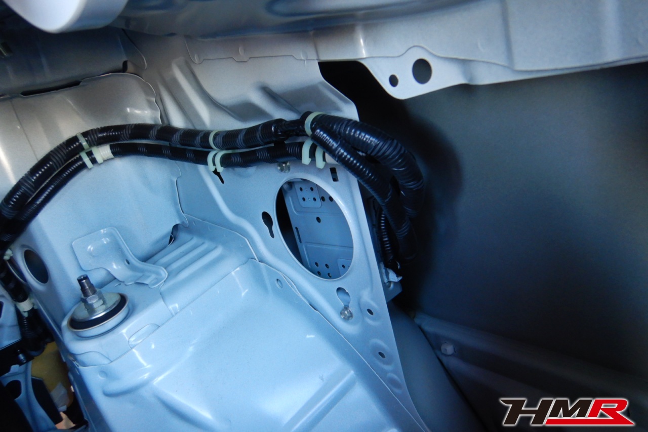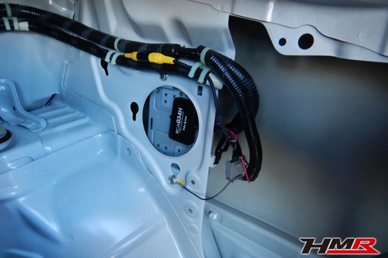 続いてバックカメラの取り付けになります。純正バックカメラをそのまま社外ナビで使用するためには接続アダプターが必要になってきますので今回はこの位置に取り付けていきます。
