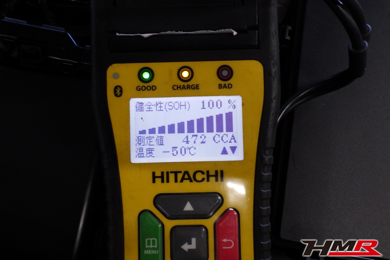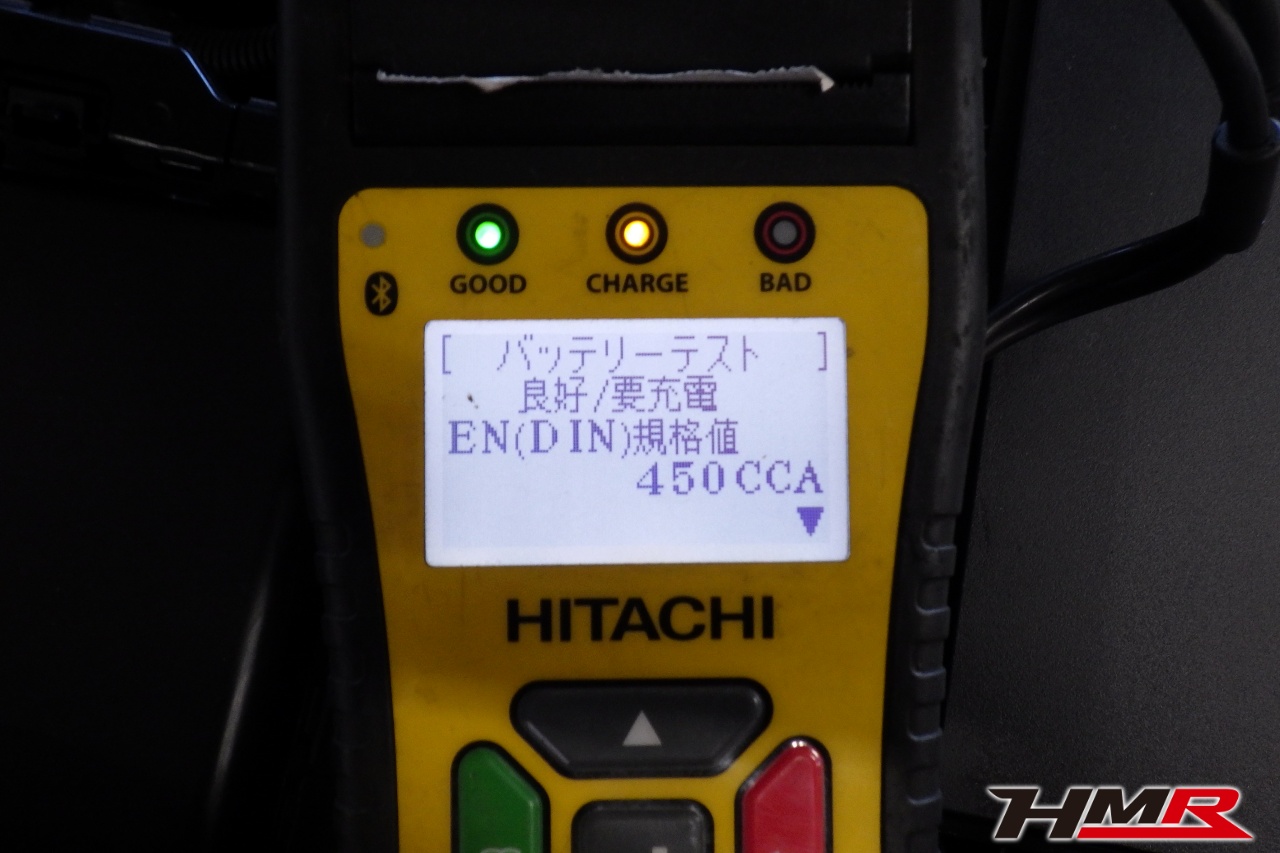バッテリー、インテークホース、エアクリーナー、補機ベルト、プラグ、ブレーキ・クラッチマスターシリンダー、各部ゴム類の劣化、パッキン類・シール類からのオイル滲み・漏れ、ラジエターの劣化、冷却水漏れ、その他異音などをチェックしました。バッテリーが弱っていましたので充電しました。
