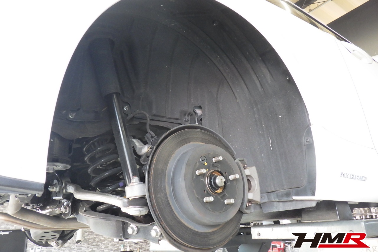 ハブベアリング・ボールジョイント、アーム・リンク類のガタ、ブッシュ・ブーツ類の劣化、エンジン・ミッション・デフからのオイル漏れと各マウント類、タイヤ溝の残量、空気圧の点検しました。特に問題ありませんでした。