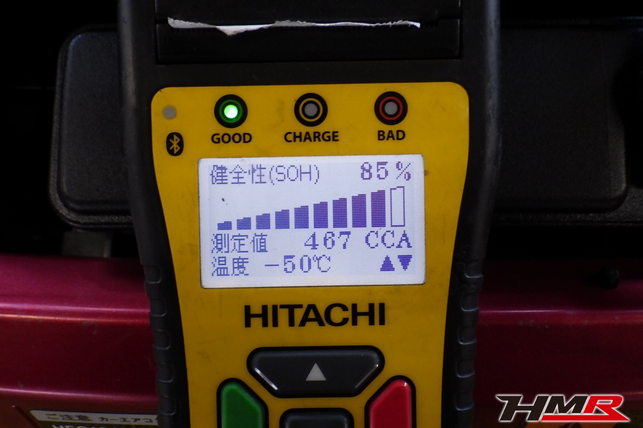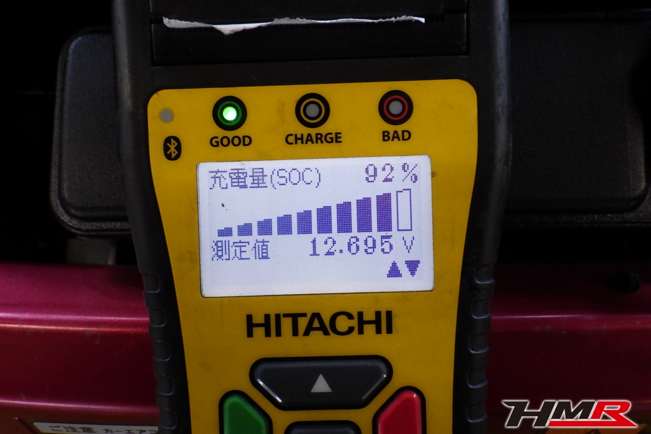 バッテリー、インテークホース、エアクリーナー、補機ベルト、プラグ、ブレーキ・クラッチマスターシリンダー、各部ゴム類の劣化、パッキン類・シール類からのオイル滲み・漏れ、ラジエターの劣化、冷却水漏れ、その他異音などをチェックしました。バッテリーが弱っていましたので充電しました。
