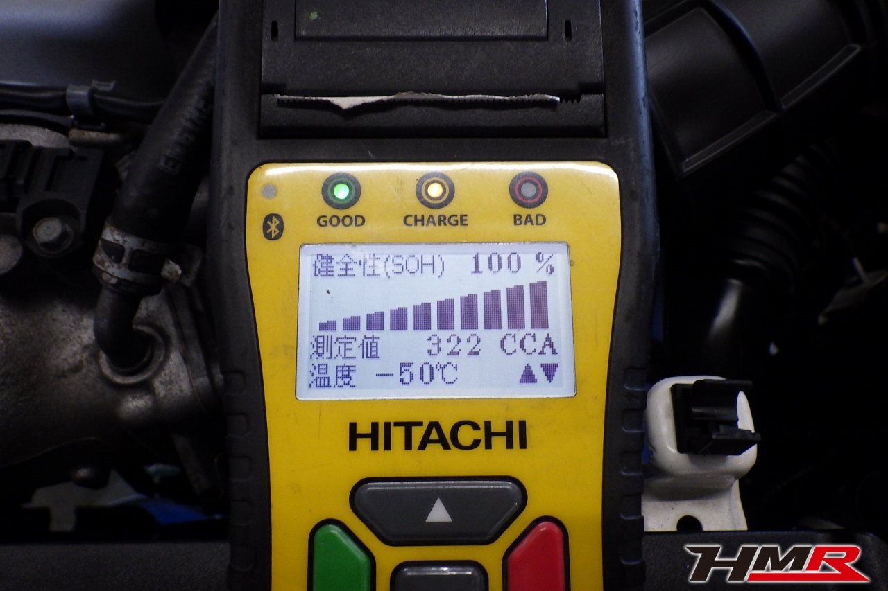 バッテリー、インテークホース、エアクリーナー、補機ベルト、プラグ、ブレーキ・クラッチマスターシリンダー、各部ゴム類の劣化、パッキン類・シール類からのオイル滲み・漏れ、ラジエターの劣化、冷却水漏れ、その他異音などをチェックしました。バッテリーが弱っていましたので充電しました。