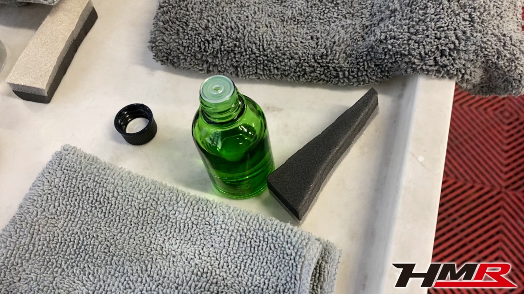 続いて窓ガラスのコーティングです。主に撥水を目的にすることが多い窓ガラスコーティングですが、気になるのはリア3面のプライバシーガラスです。こちらに撥水タイプのコーティングを施すと、撥水した雨粒が日で焼けてガラスに焼き付いてしまう可能性があります。特にリアハッチのガラスですね。そのため、フロントは通常の撥水タイプを使い、リアは浸水タイプのコーティング剤を塗布することにします。
