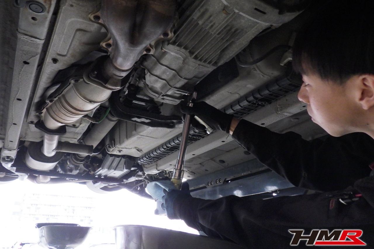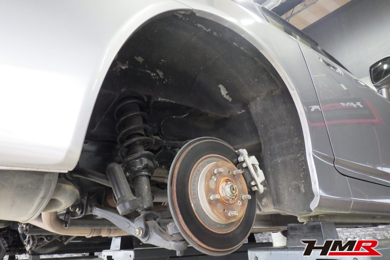 ハブベアリング・ボールジョイント、アーム・リンク類のガタ、ブッシュ・ブーツ類の劣化、エンジン・ミッション・デフからのオイル漏れと各マウント類、タイヤ溝の残量、空気圧の点検しました。フロントロアアームブーツ、左右トーロッドブーツにヒビが見られましたが、早急に交換する必要は無かったため今後交換していくことをおすすめします。またリア右側スタビリンクブーツは切れていましたので交換を行いました。