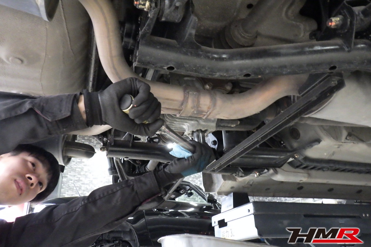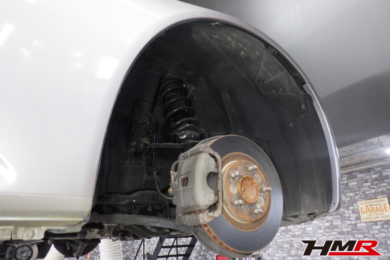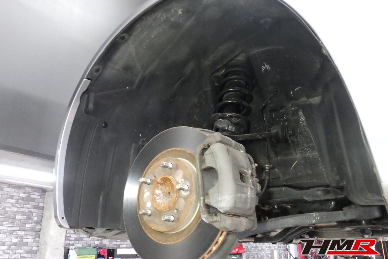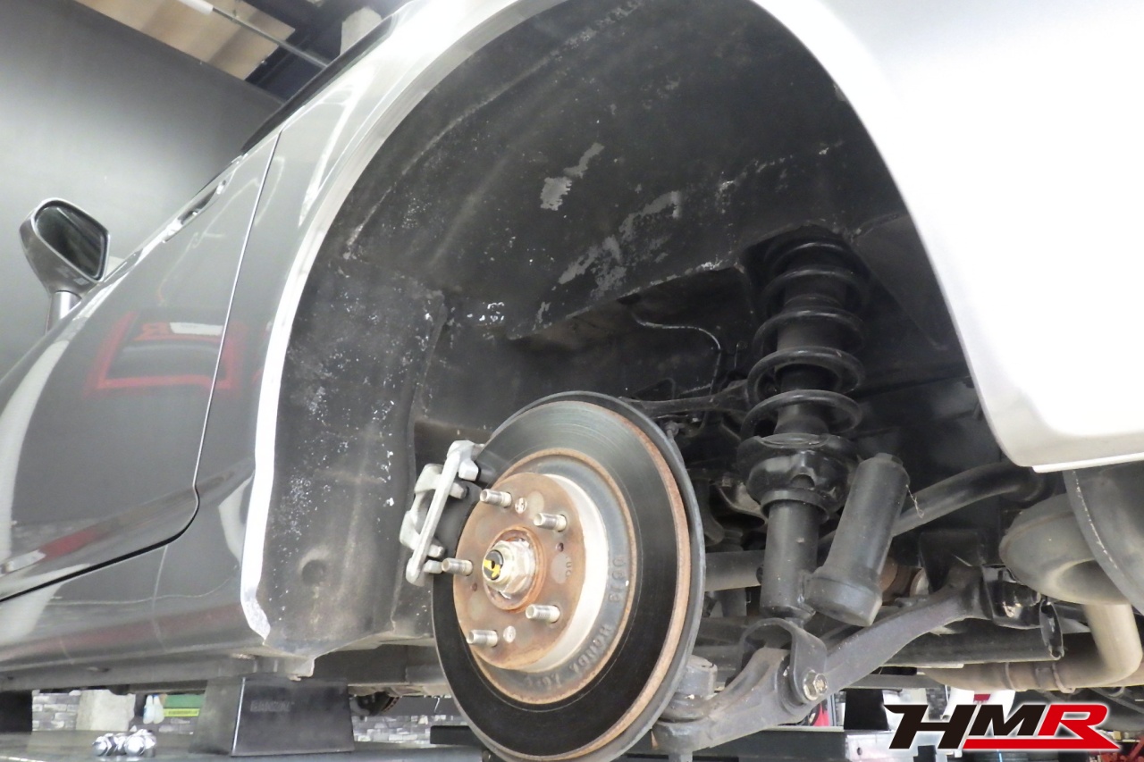 ハブベアリング・ボールジョイント、アーム・リンク類のガタ、ブッシュ・ブーツ類の劣化、エンジン・ミッション・デフからのオイル漏れと各マウント類、タイヤ溝の残量、空気圧の点検しました。フロントロアアームブーツ、左右トーロッドブーツにヒビが見られましたが、早急に交換する必要は無かったため今後交換していくことをおすすめします。またリア右側スタビリンクブーツは切れていましたので交換を行いました。