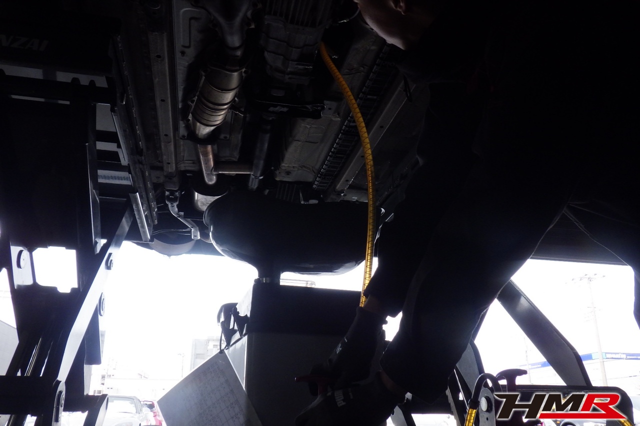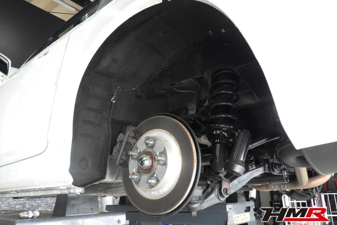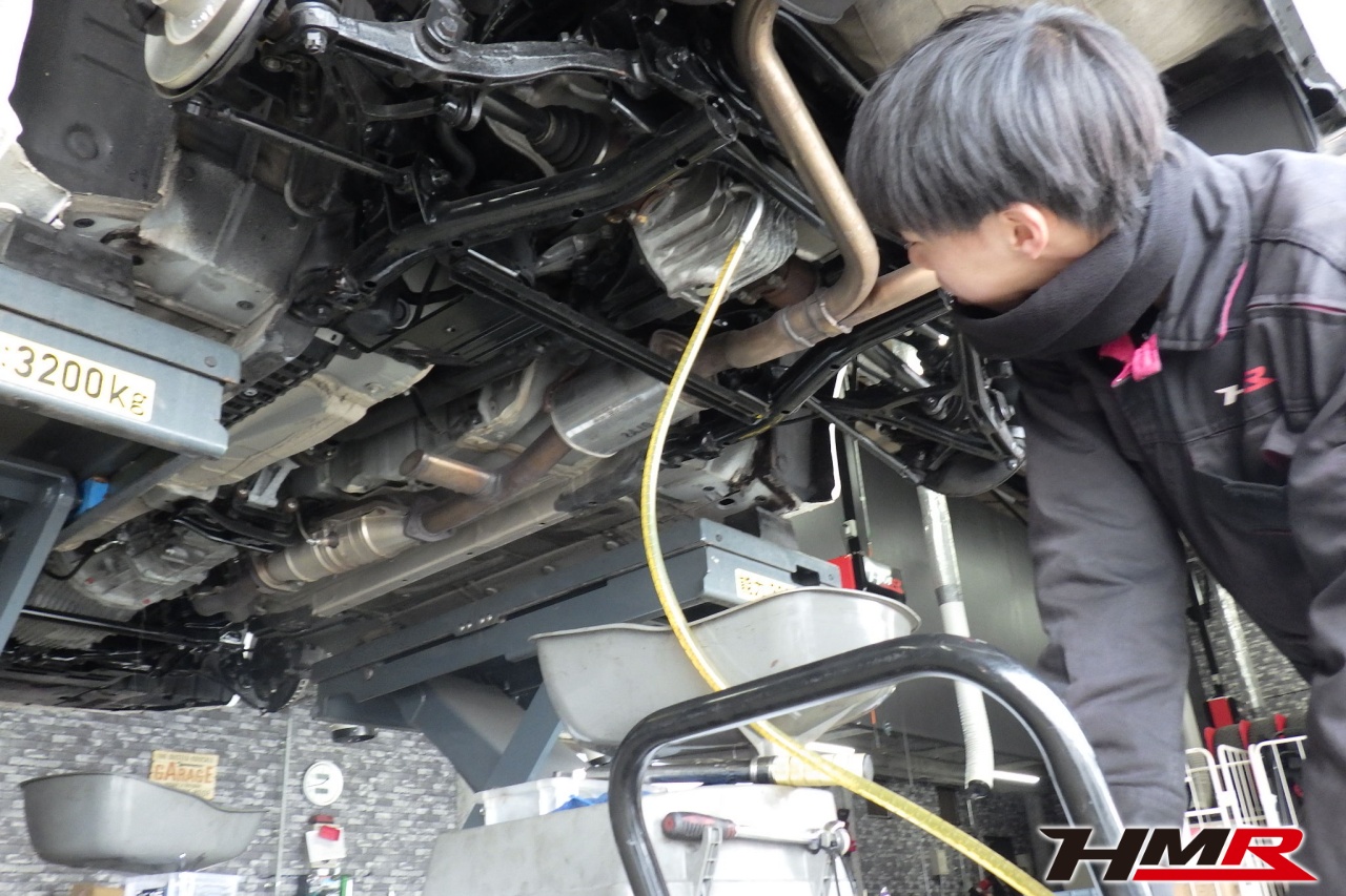 ハブベアリング・ボールジョイント、アーム・リンク類のガタ、ブッシュ・ブーツ類の劣化、エンジン・ミッション・デフからのオイル漏れと各マウント類、タイヤ溝の残量、空気圧の点検を行いました。リア左右スタビリンクブーツが切れていましたので交換しました。