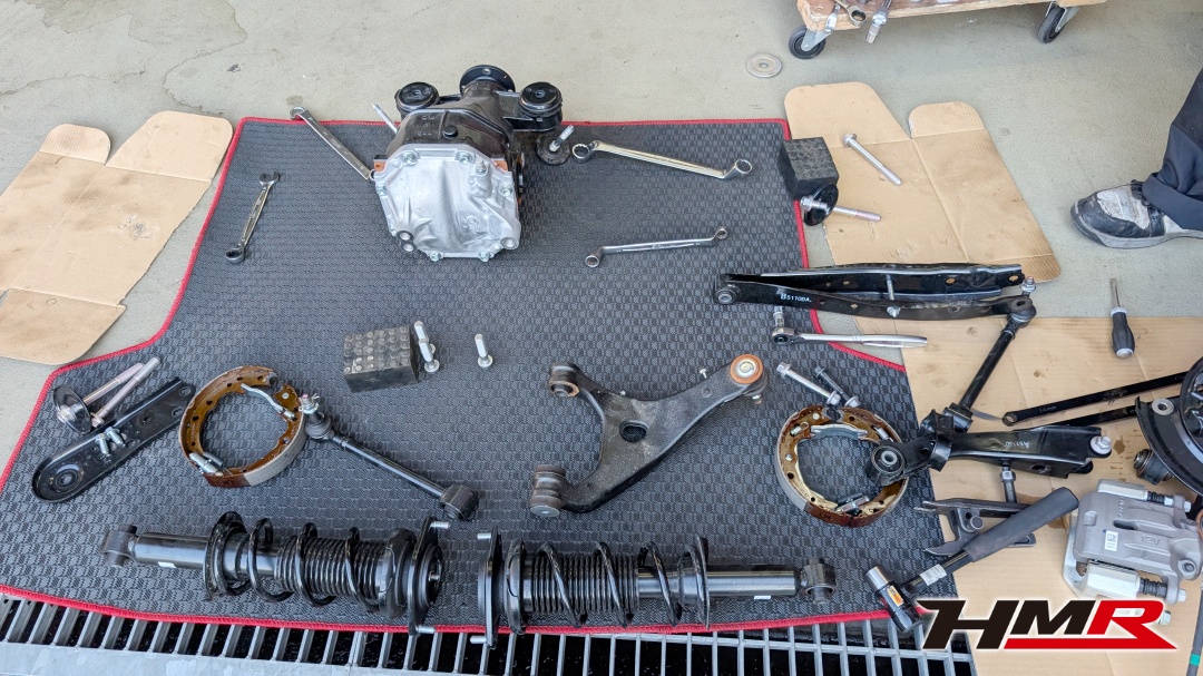 最初は足回りから。タイヤを外してミッションオイル、エンジンオイルを抜きつつ大量のブッシュ交換があるので足回りをバラしていきます。流石NATS卒業生といった感じでサクサク作業を進めていくたっちー(´ー`)