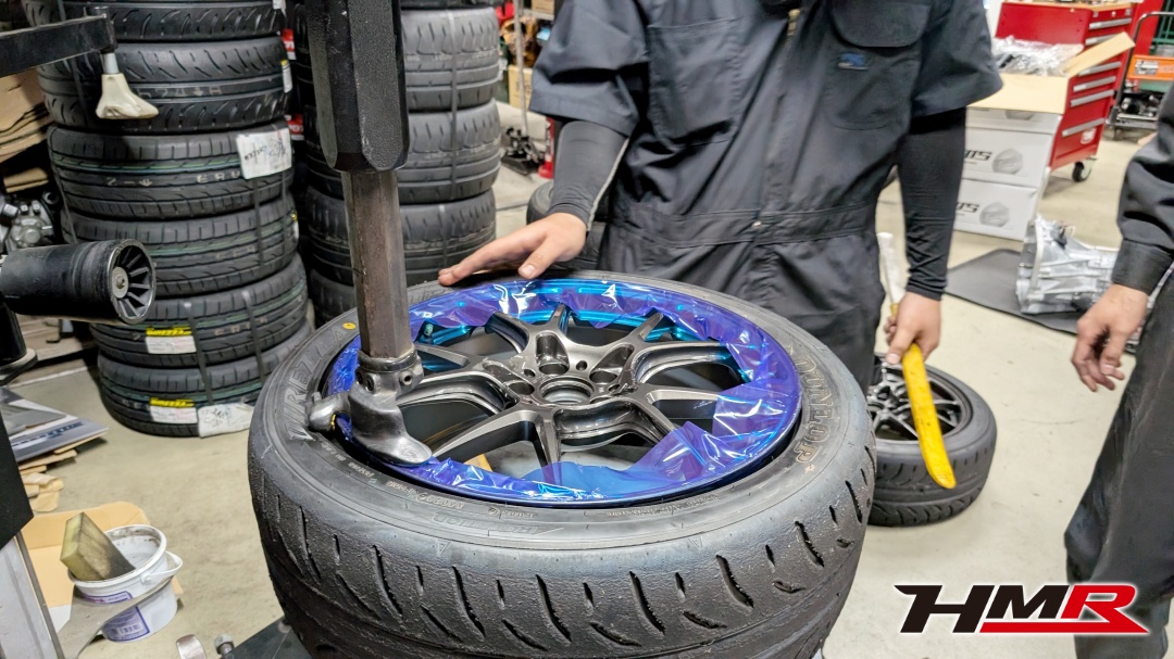 タイヤを組むのはあまりやってこなかったようで、なかなかうまくできず苦戦するたっちー(;^ω^)