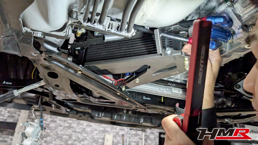 ミッションオイルクーラー取付け。オイルクーラーは取付けが大変なので矢澤メカニックが取付け!