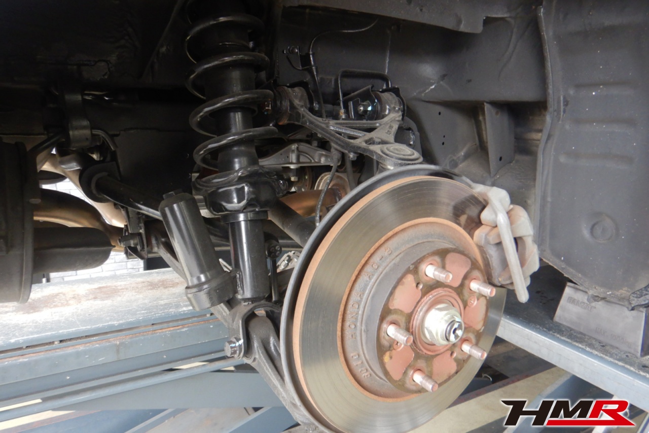 ハブベアリング・ボールジョイント、アーム・リンク類のガタ、ブッシュ・ブーツ類の劣化、エンジン・ミッション・デフからのオイル漏れと各マウント類、タイヤ溝の残量、空気圧の点検を行いました。左側スタビリンクブーツが切れていましたので交換しました。