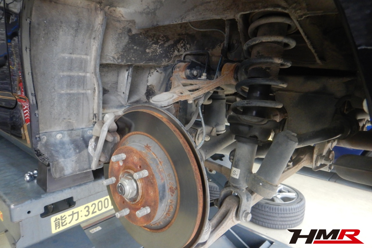 ハブベアリング・ボールジョイント、アーム・リンク類のガタ、ブッシュ・ブーツ類の劣化、エンジン・ミッション・デフからのオイル漏れと各マウント類、タイヤ溝の残量、空気圧の点検しました。特に問題ありませんでした。