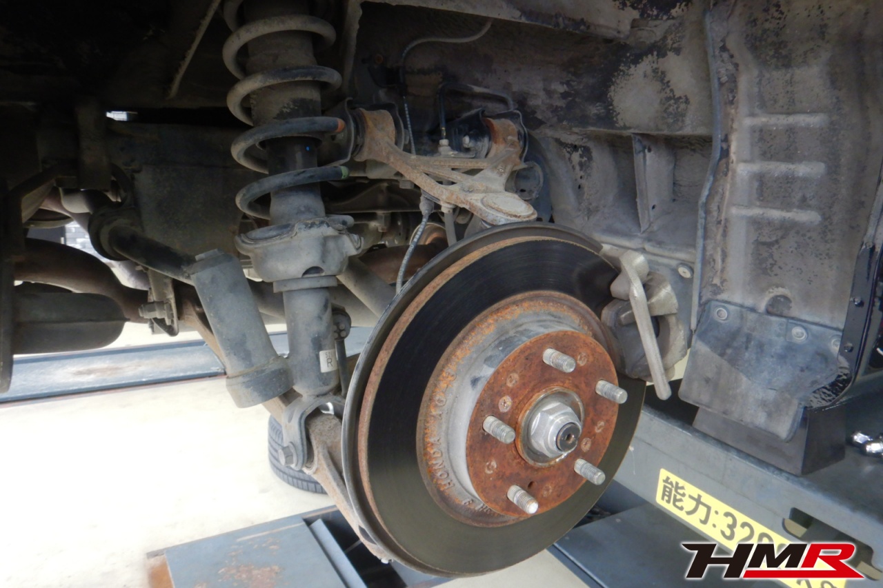 ハブベアリング・ボールジョイント、アーム・リンク類のガタ、ブッシュ・ブーツ類の劣化、エンジン・ミッション・デフからのオイル漏れと各マウント類、タイヤ溝の残量、空気圧の点検しました。特に問題ありませんでした。