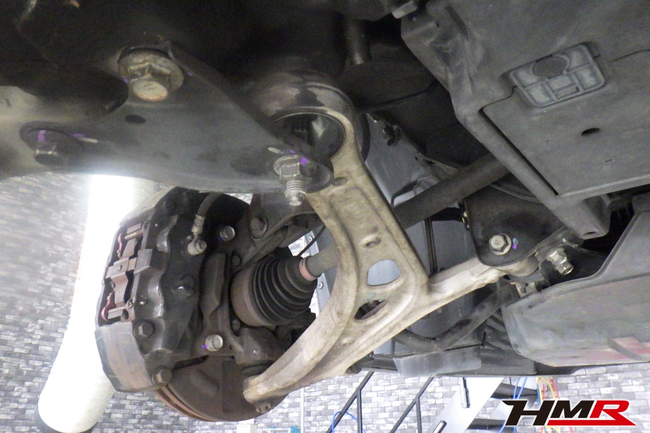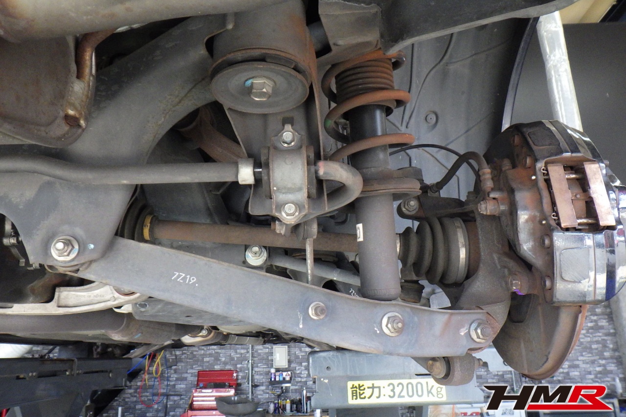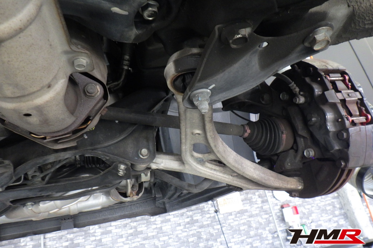 ハブベアリング・ボールジョイント、アーム・リンク類のガタ、ブッシュ・ブーツ類の劣化、エンジン・ミッション・デフからのオイル漏れと各マウント類、タイヤ溝の残量、空気圧の点検しました。左右フロントロアアーム、リアブッシュ、右側ステアリングラックブーツ、右側タイロッドエンドブーツが切れていましたので交換しました。タイヤの残り溝はフロント5.9mm・リア5.7mmでした。
