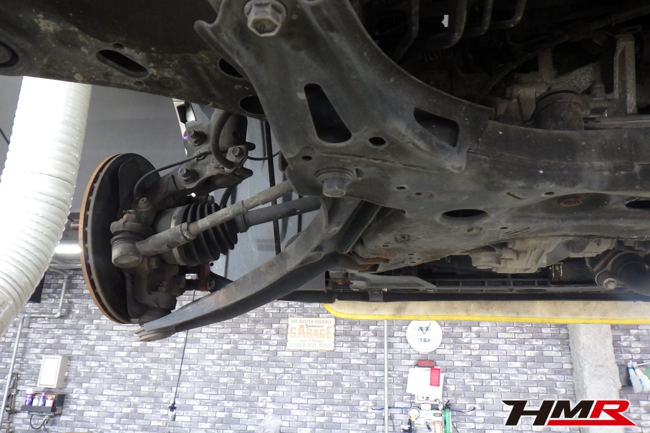 ハブベアリング・ボールジョイント、アーム・リンク類のガタ、ブッシュ・ブーツ類の劣化、エンジン・ミッション・デフからのオイル漏れと各マウント類、タイヤ溝の残量、空気圧の点検しました。右側タイロッドエンドブーツにヒビ、フロントロアアームブッシュにヒビが見られましたがこちらも早急に交換する必要は無かったため今後乗っていく中で交換することをおすすめします。タイヤ溝の残量は、フロント7.7mm・リア7.7mmでした。