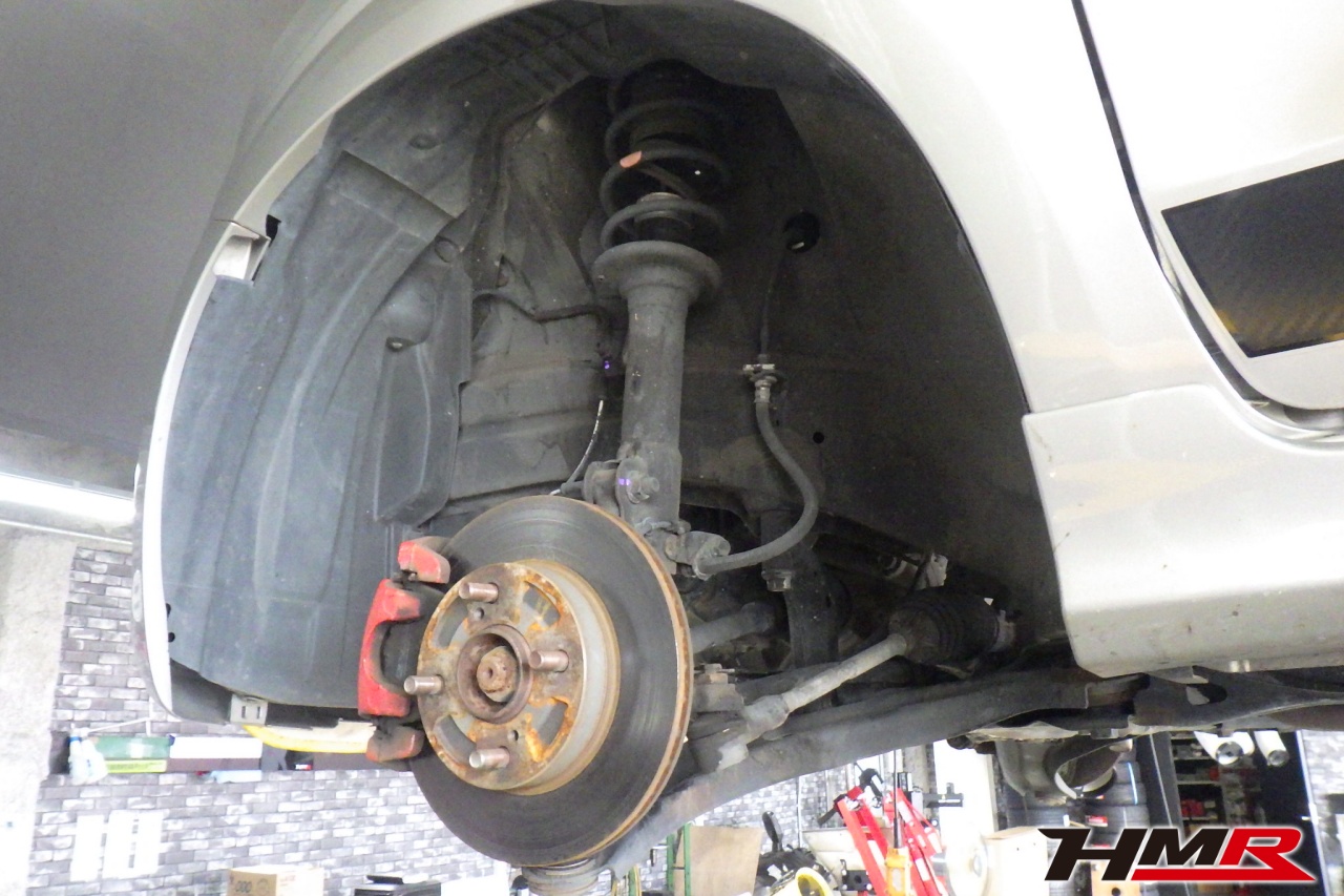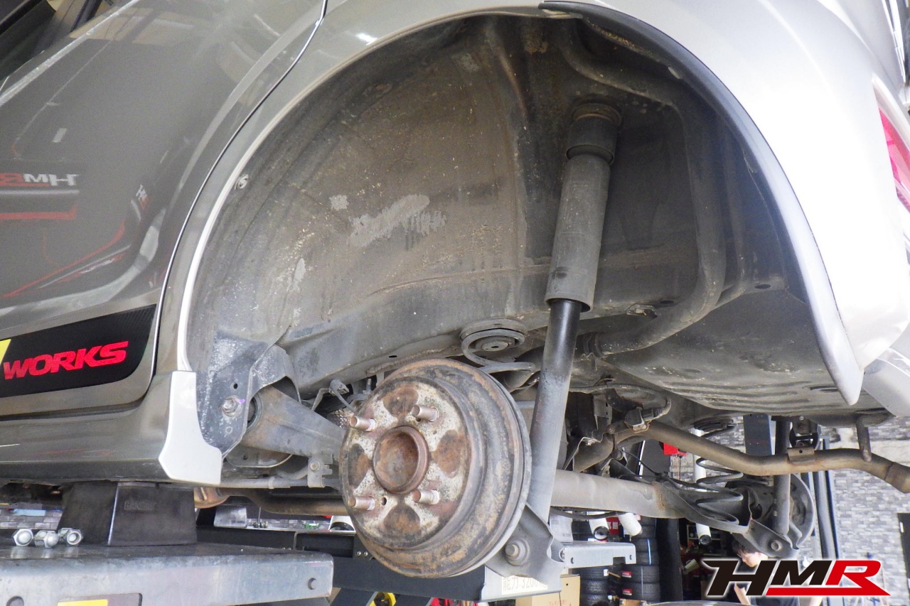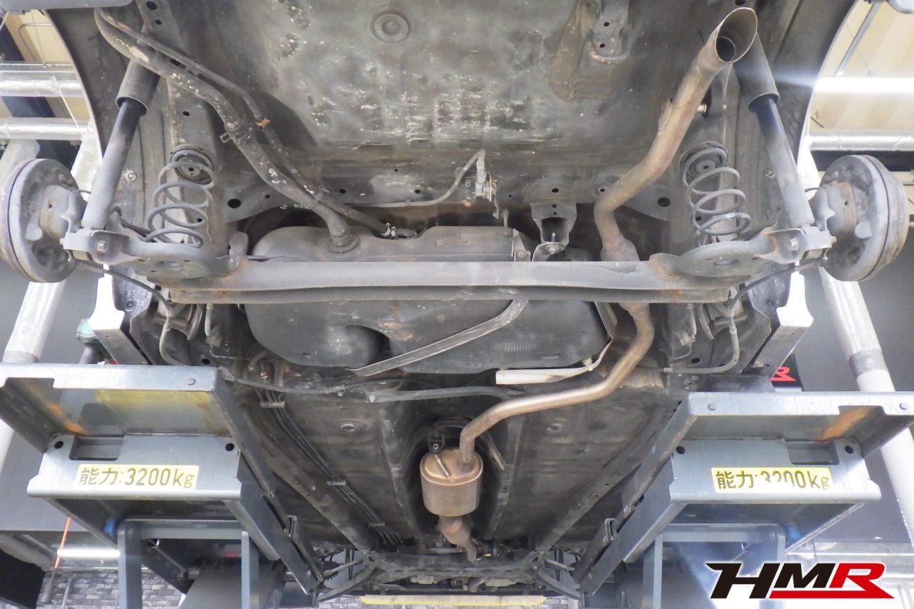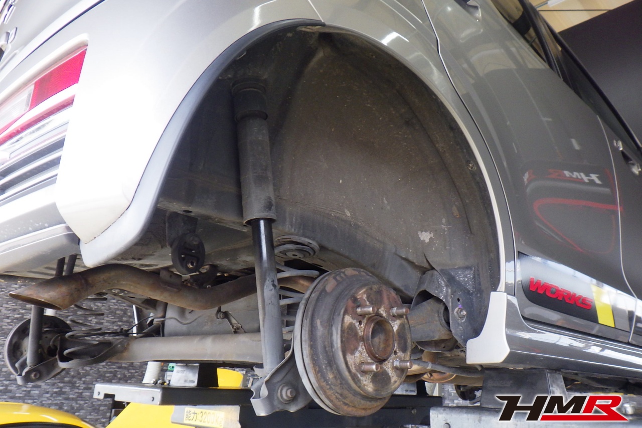 ハブベアリング・ボールジョイント、アーム・リンク類のガタ、ブッシュ・ブーツ類の劣化、エンジン・ミッション・デフからのオイル漏れと各マウント類、タイヤ溝の残量、空気圧の点検しました。右側タイロッドエンドブーツにヒビ、フロントロアアームブッシュにヒビが見られましたがこちらも早急に交換する必要は無かったため今後乗っていく中で交換することをおすすめします。タイヤ溝の残量は、フロント7.7mm・リア7.7mmでした。