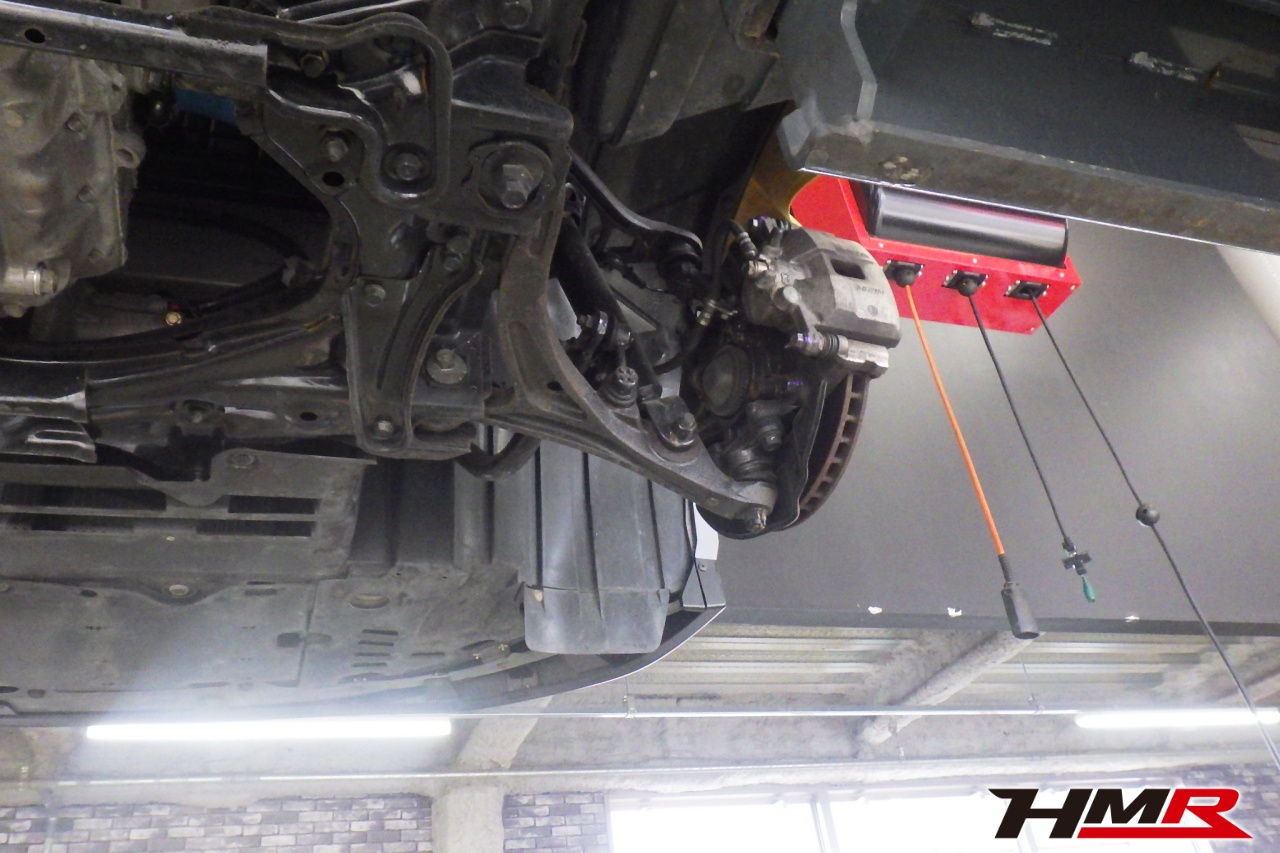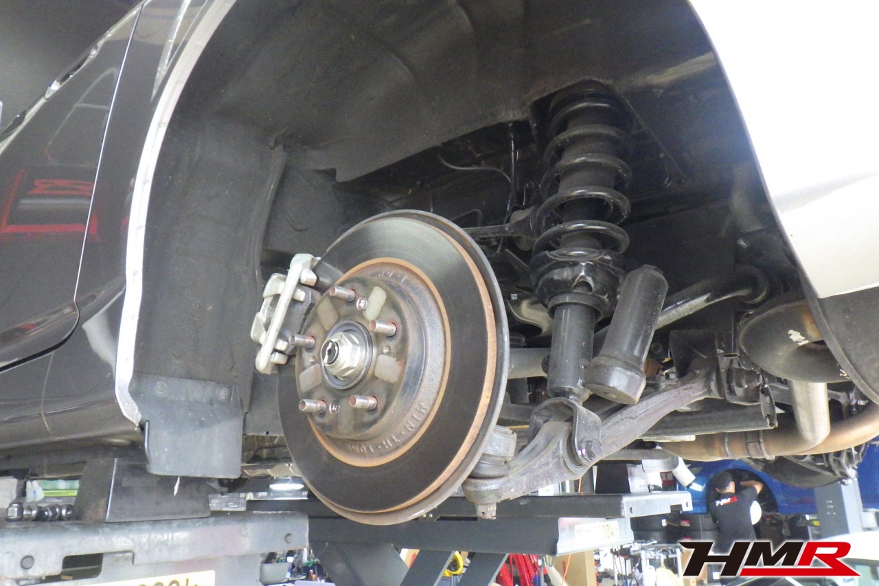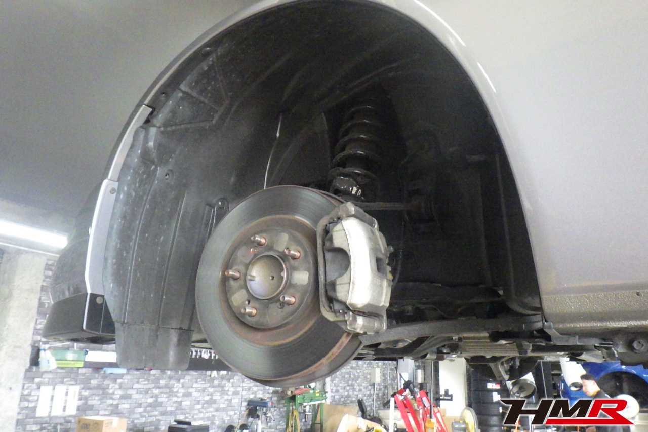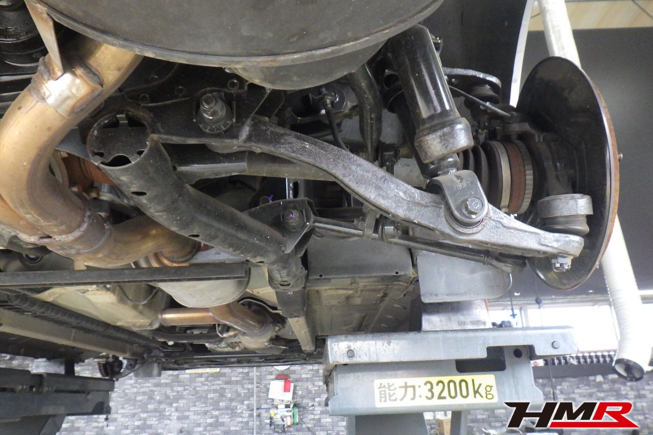 ハブベアリング・ボールジョイント、アーム・リンク類のガタ、ブッシュ・ブーツ類の劣化、エンジン・ミッション・デフからのオイル漏れと各マウント類、タイヤ溝の残量、空気圧の点検を行いました。左右タイロッドエンドブーツ、左右フロントスタビリンクブーツ、左側トーコンロッドブーツが切れていましたのでそれぞれ交換しました。
