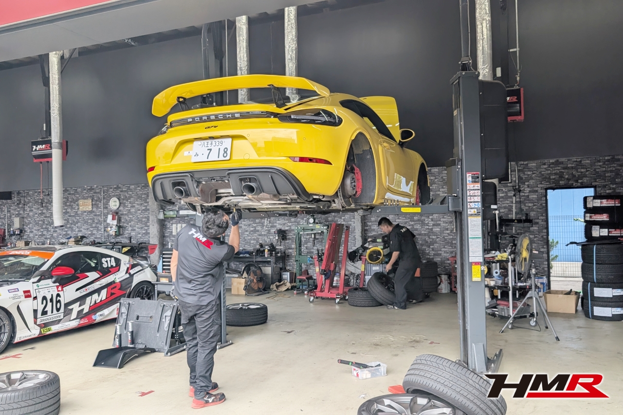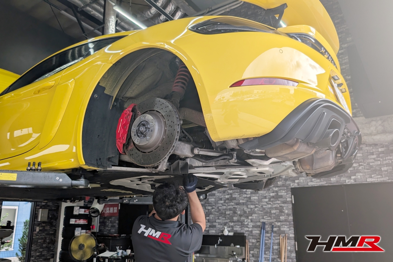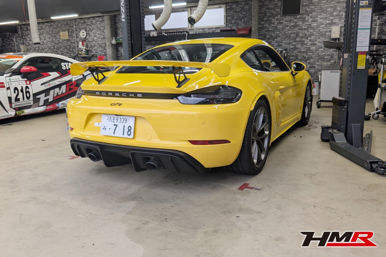 こんにちは。HMR広報の小川です。今回はポルシェケイマンを本格的に取り扱うにあたり、整備やメンテナンスについての勉強もかねて718ケイマンGT4が入庫したので整備記録を残していこうと思います。まずは整備の基本中の基本、エンジンオイルとミッションオイルの交換です。今回作業するのは邑松メカニック。早速作業に取り掛かります。