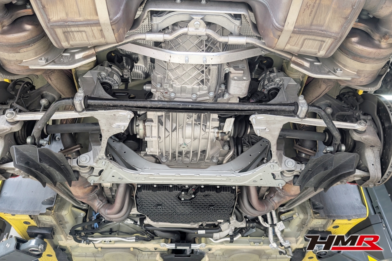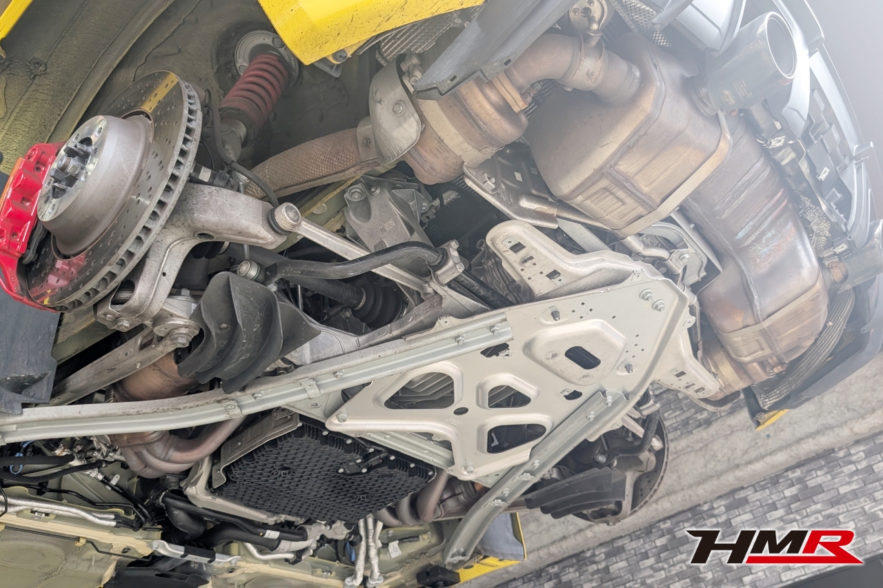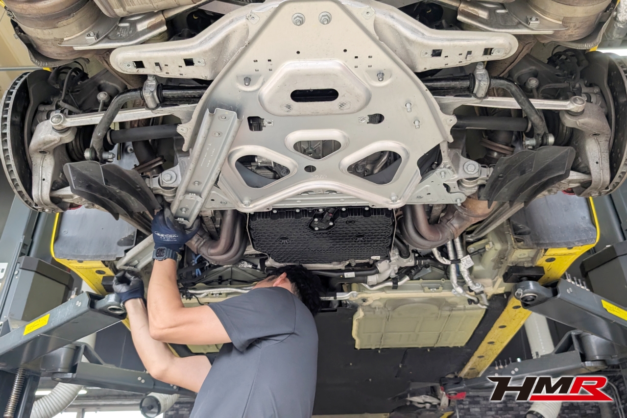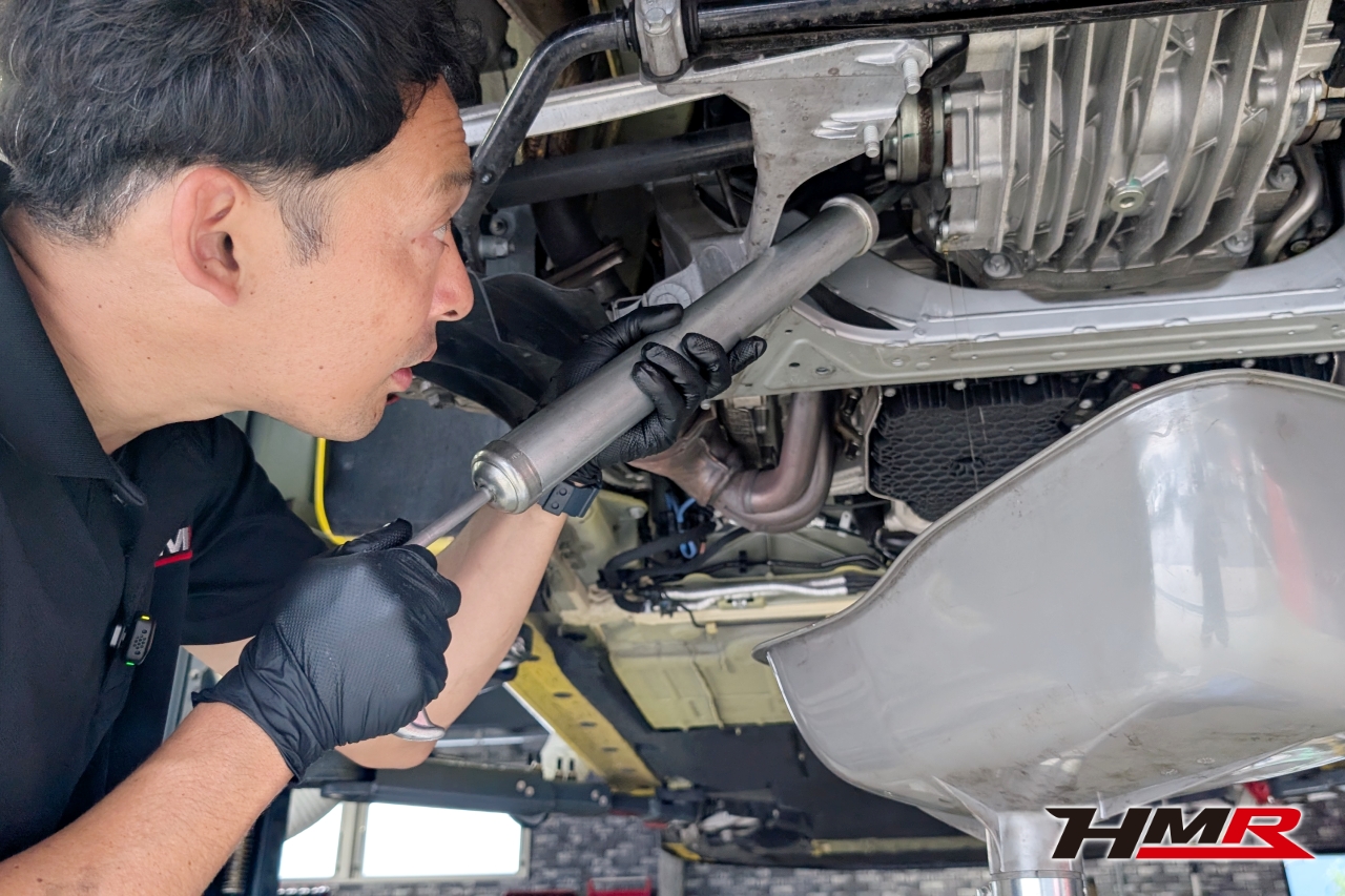 こんにちは。HMR広報の小川です。今回はポルシェケイマンを本格的に取り扱うにあたり、整備やメンテナンスについての勉強もかねて718ケイマンGT4が入庫したので整備記録を残していこうと思います。まずは整備の基本中の基本、エンジンオイルとミッションオイルの交換です。今回作業するのは邑松メカニック。早速作業に取り掛かります。
