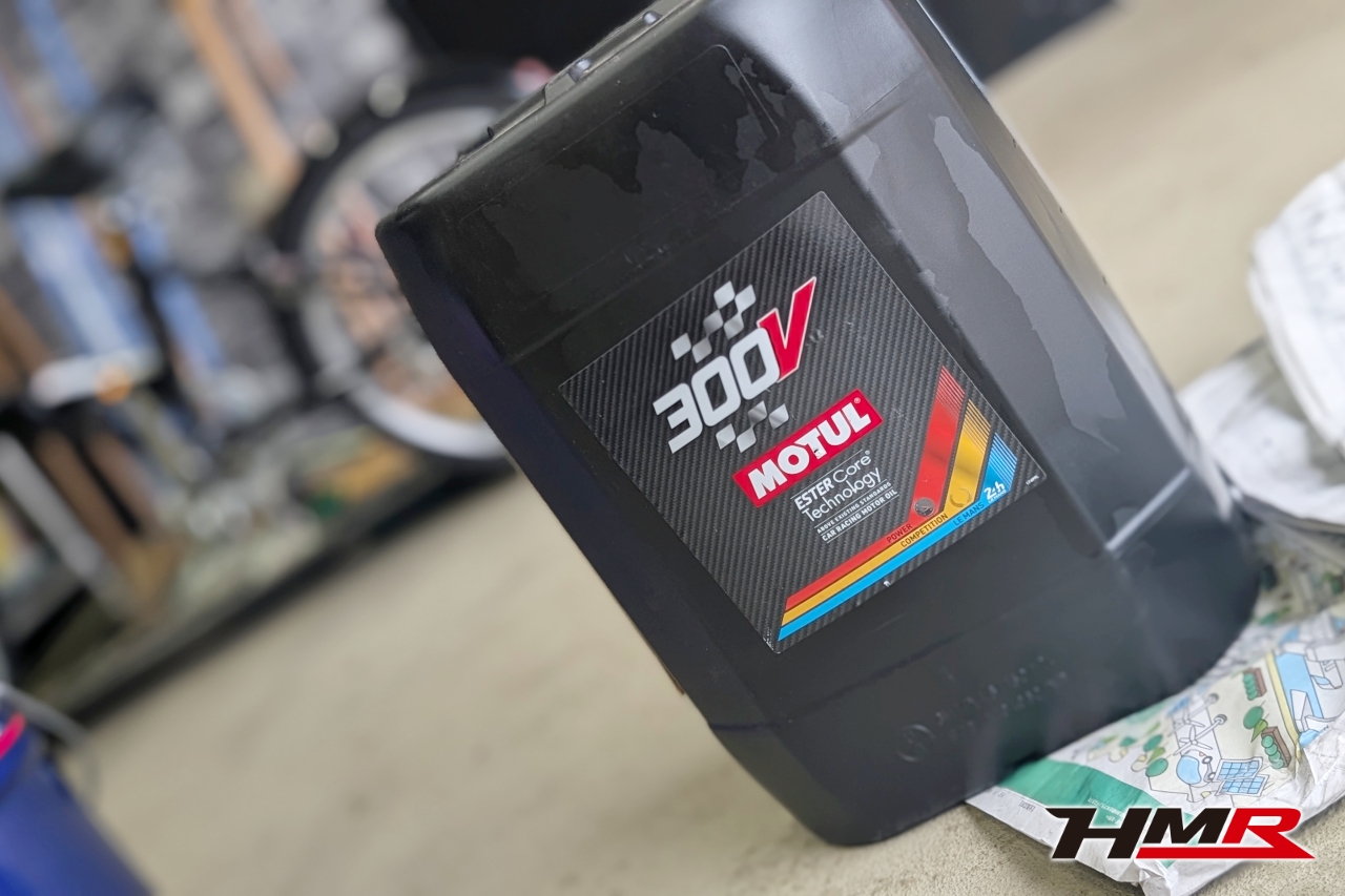 それではエンジンオイルを入れていきます。入れるオイルはMOTULさんの300Vです。