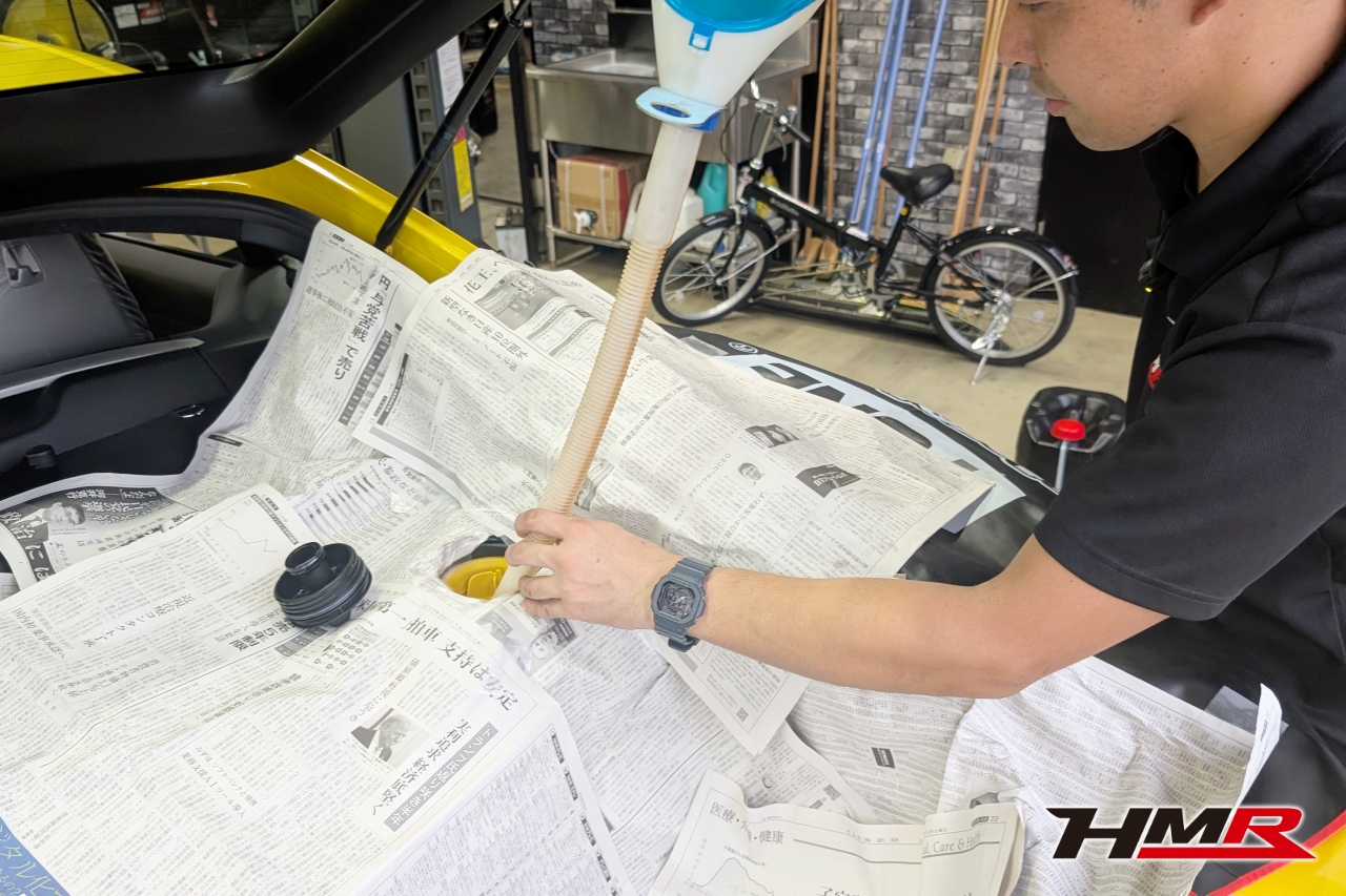 ポルシェケイマンはミッドシップエンジンなのでオイル注入する場所が車内にあります。座席の後に黒色の丸い蓋が二つあり右側がエンジンオイル、左側がクーラントになります。車内にオイルが垂れないようしっかり養生していきます。