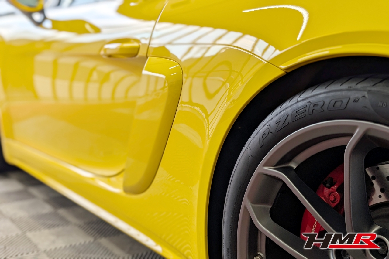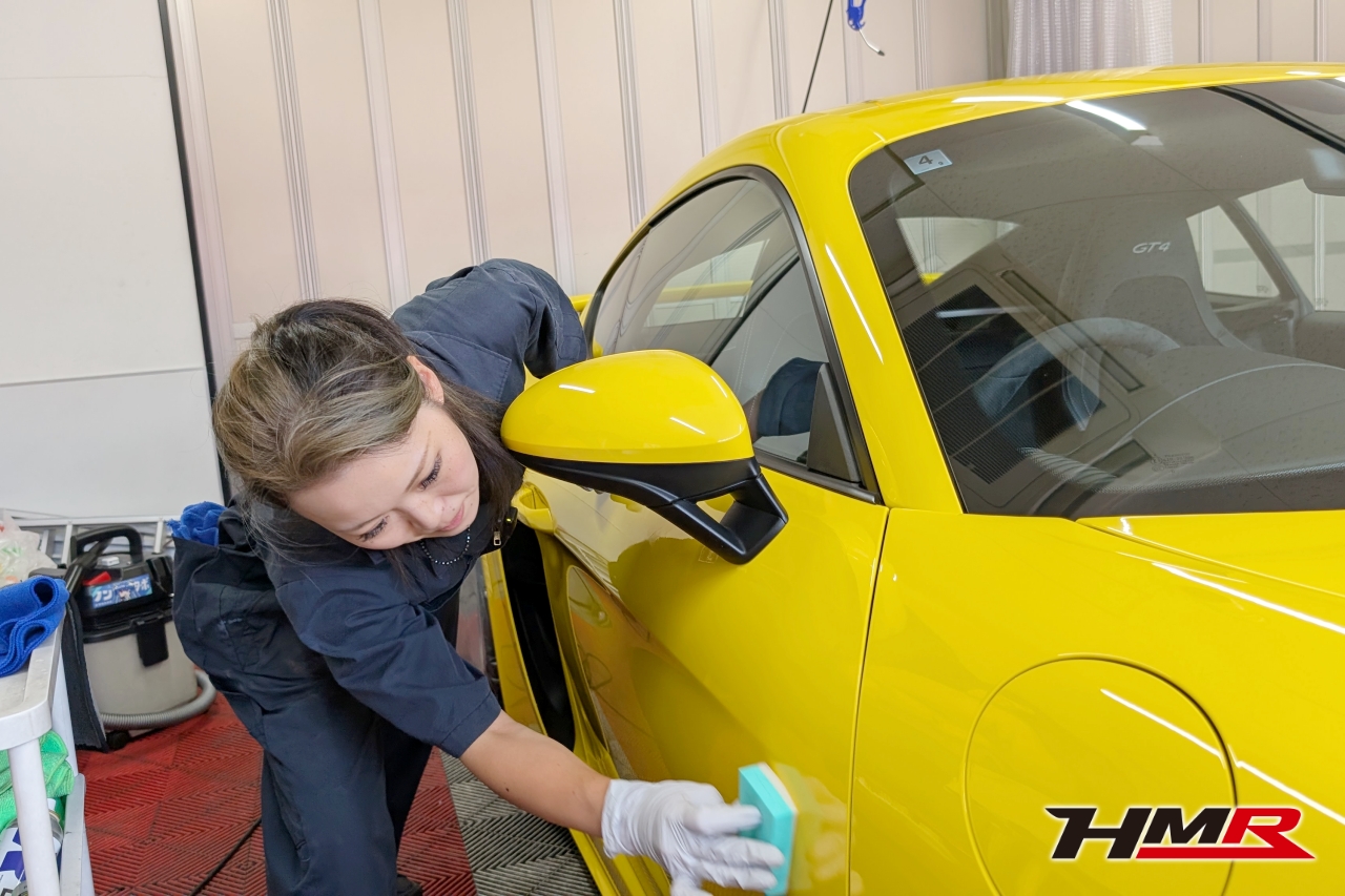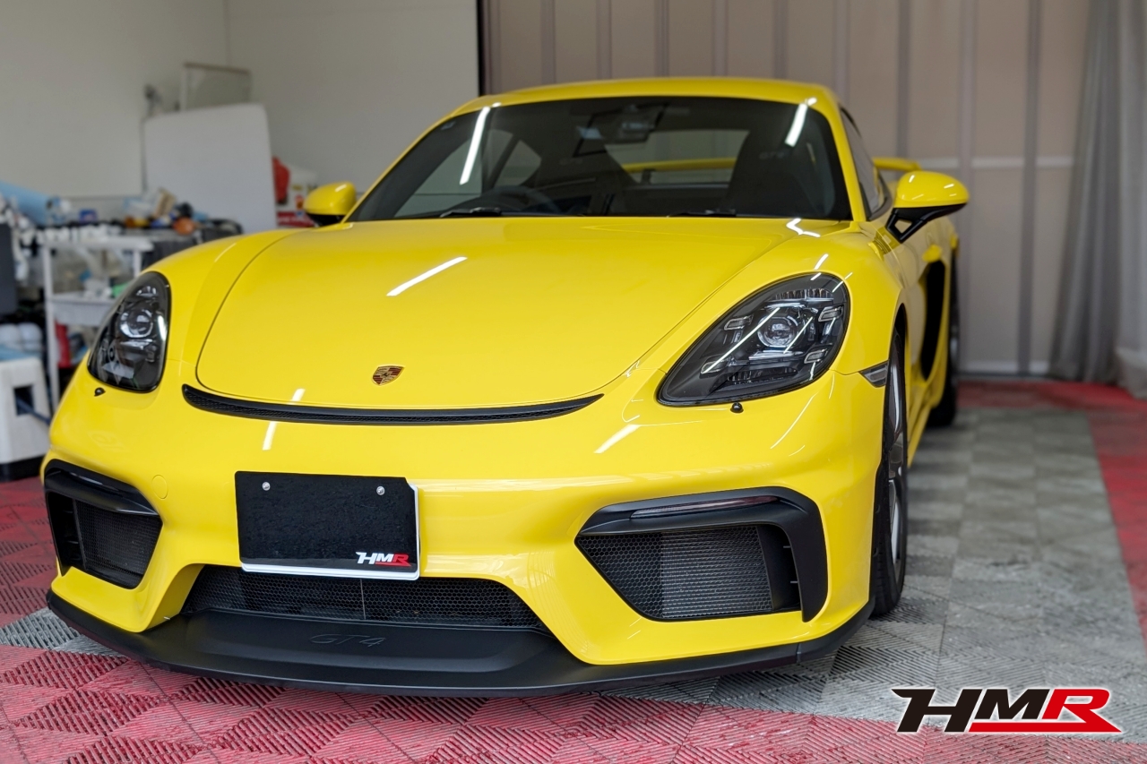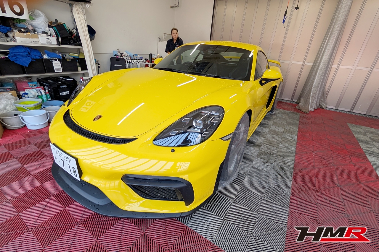こんにちは。HMR広報の小川です。今回は以前エンジンオイル・ミッションオイル交換を行ったポルシェケイマンGT4のボディコーティングをしていきます。コーティングはKeeperの「フレッシュキーパー」を施工していきます。また、樹脂パーツはフレッシュキーパーの施工も可能ですが今回はより特化した「樹脂フェンダーキーパー」を施工していきます。施工するスタッフはコーティングスタッフのSAKIです。