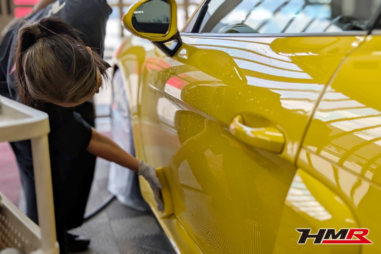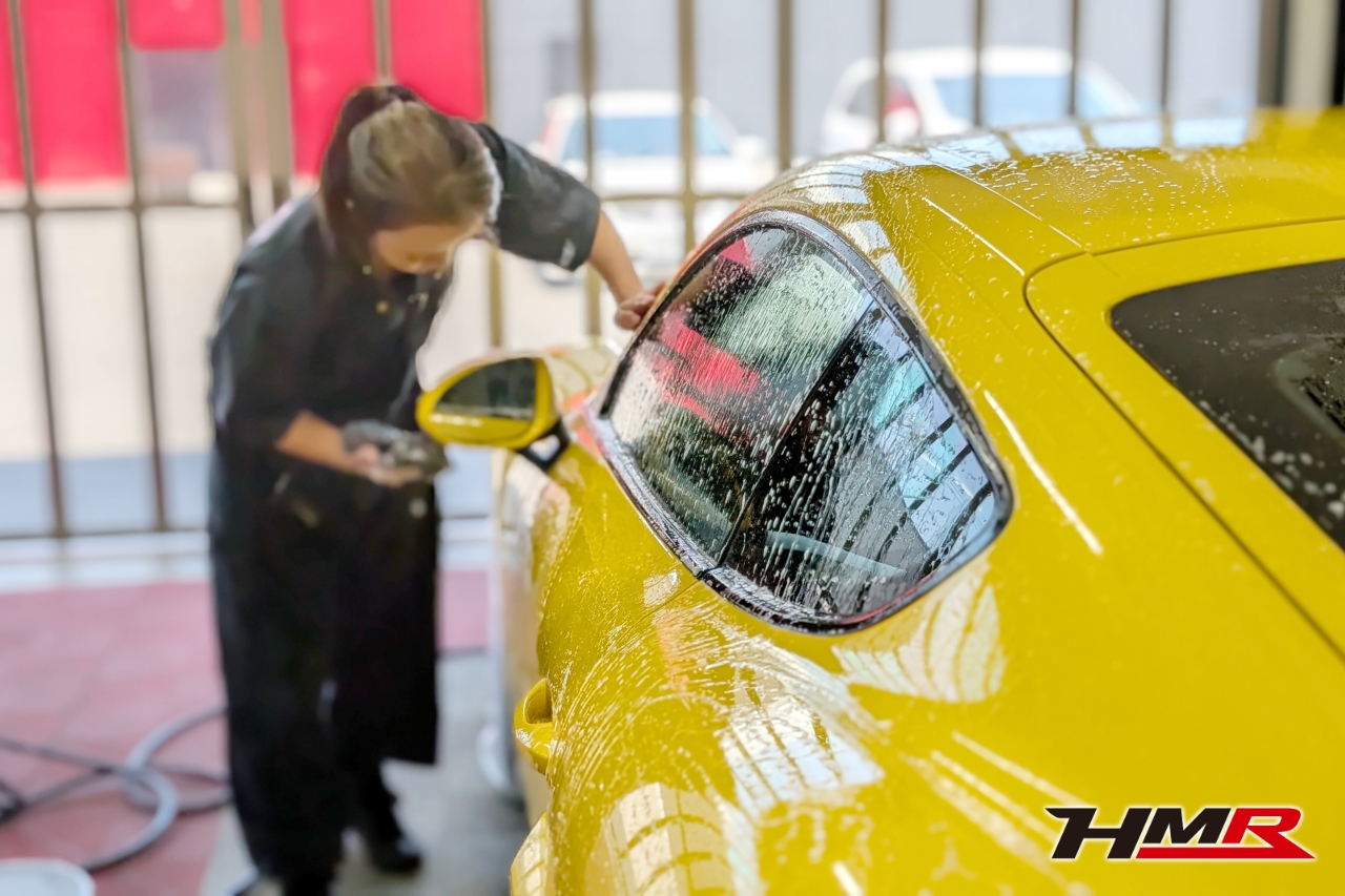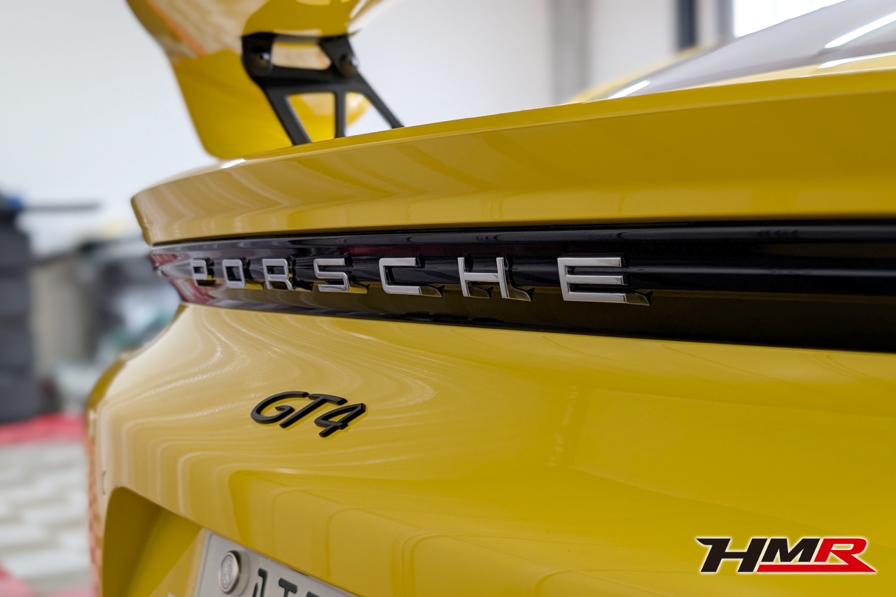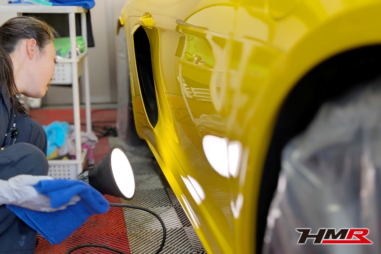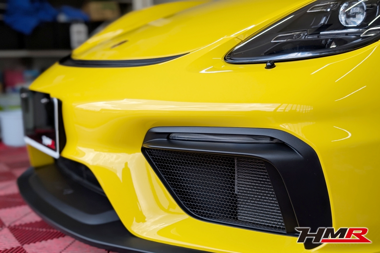 こんにちは。HMR広報の小川です。今回は以前エンジンオイル・ミッションオイル交換を行ったポルシェケイマンGT4のボディコーティングをしていきます。コーティングはKeeperの「フレッシュキーパー」を施工していきます。また、樹脂パーツはフレッシュキーパーの施工も可能ですが今回はより特化した「樹脂フェンダーキーパー」を施工していきます。施工するスタッフはコーティングスタッフのSAKIです。