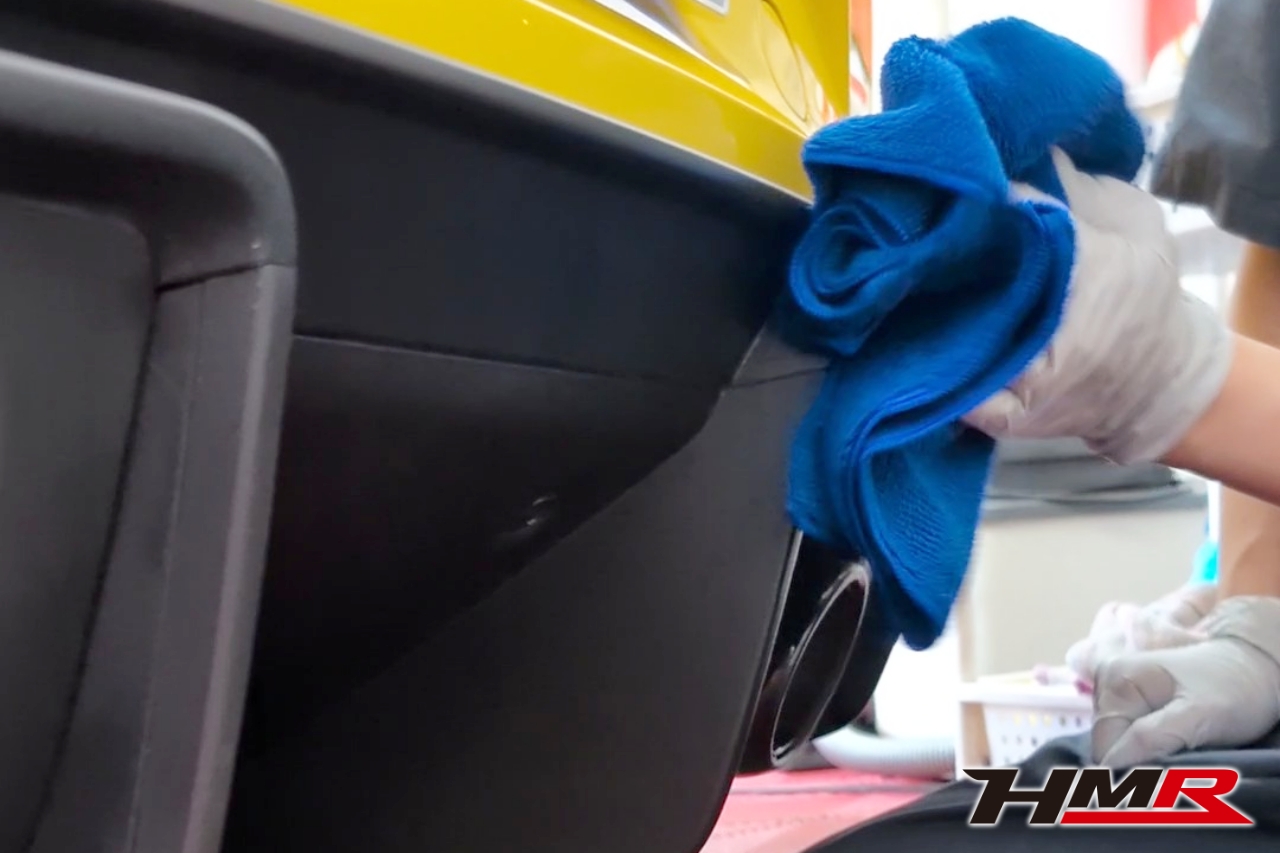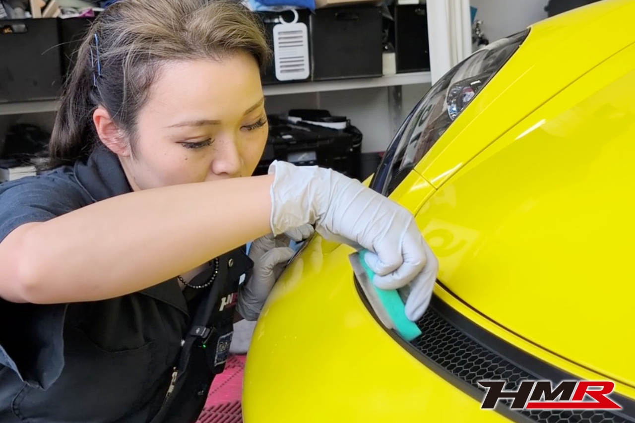 1層目より硬化速度が早いので細かくボディの部分をエリア分けして施工をしていきます。スポンジで液剤を塗っていきクロスを使って拭いていきます。
