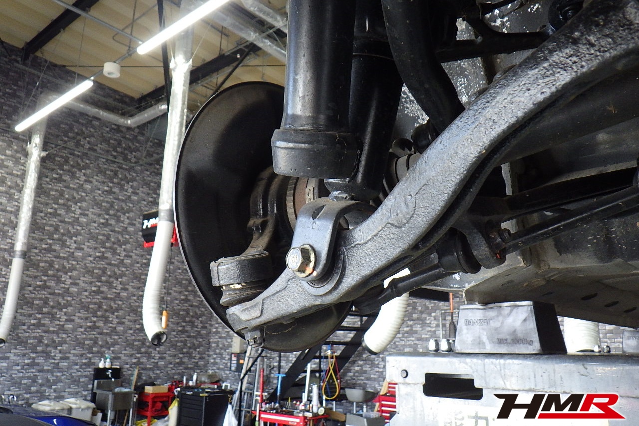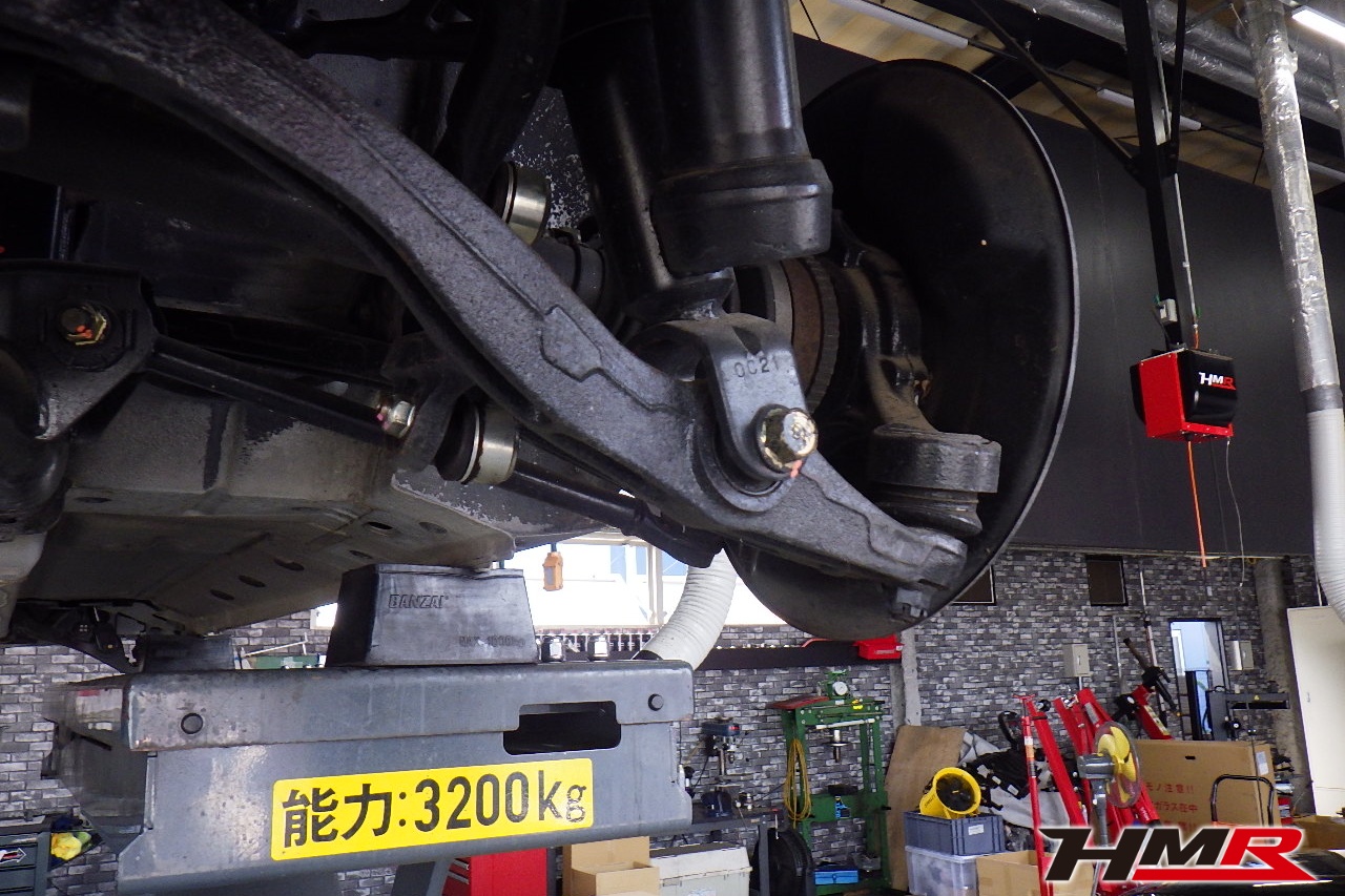 ハブベアリング・ボールジョイント、アーム・リンク類のガタ、ブッシュ・ブーツ類の劣化、エンジン・ミッション・デフからのオイル漏れと各マウント類、タイヤ溝の残量、空気圧の点検しました。フロント左右フロントロアアームブッシュにヒビ、リア左右トーコンロッドブールにヒビが見られましたが、こちらも早急に交換する必要は無いため今後交換することをおすすめします。タイヤの残り溝がフロント7.1mm・リア7.0mmでした。