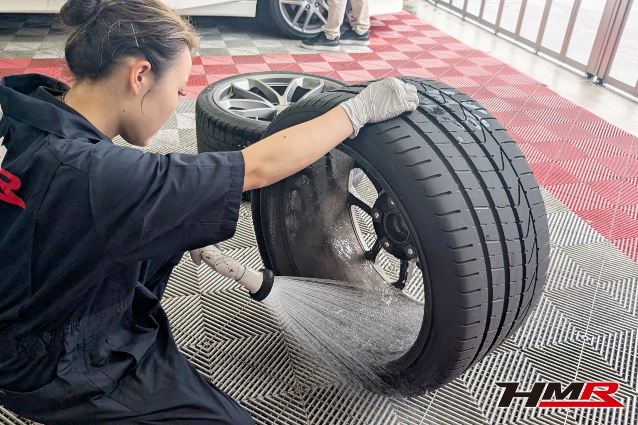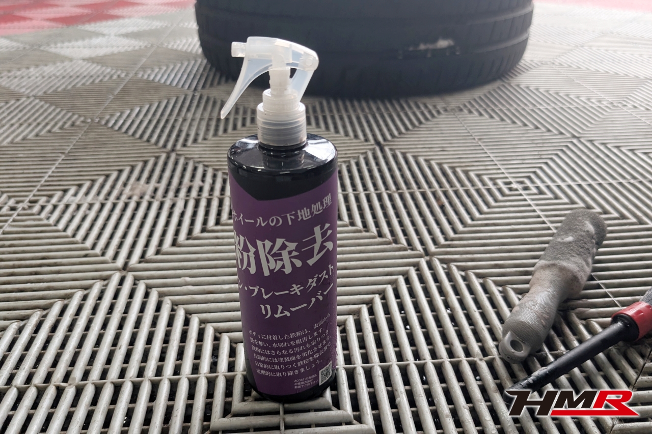 まずはホイールの洗浄をしていきます。ホイールに水をかけて鉄粉除去剤を使用し、ブレーキダストを化学的に分解します。