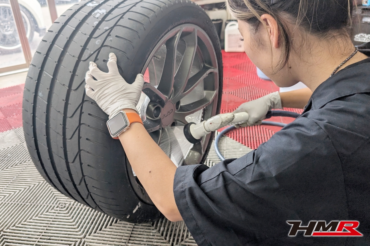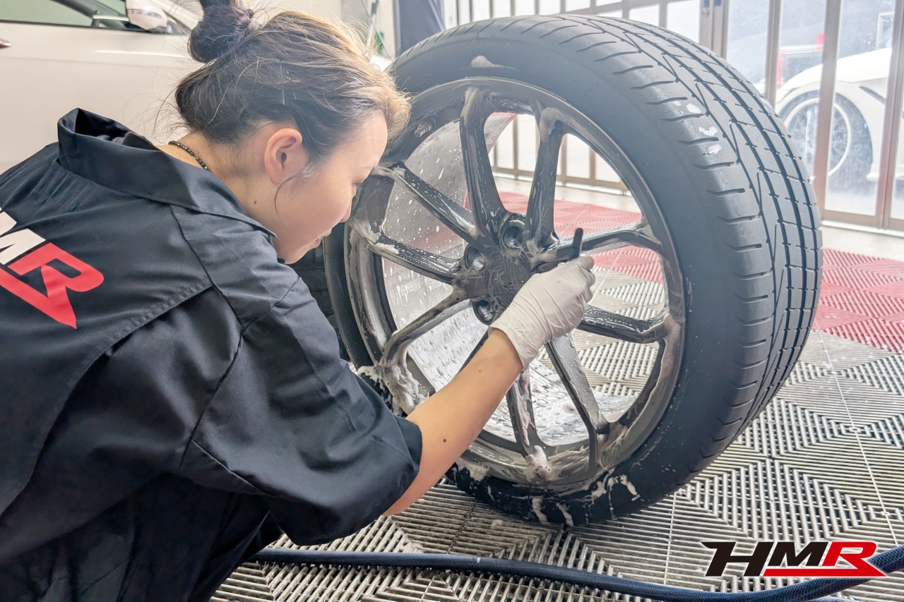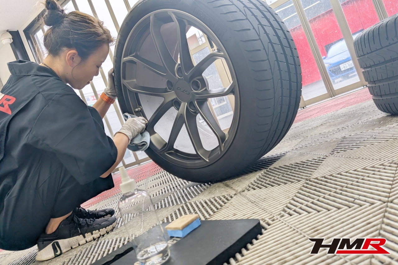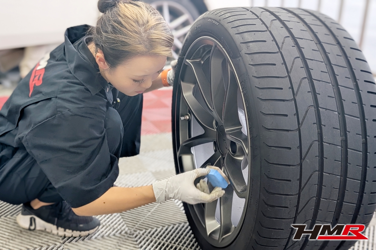 こんにちは。HMR広報の小川です。今回は以前フレッシュキーパーコーティングを行ったポルシェケイマンGT4のホイールコーティングを施工していきます。スポーツカーを中心に、ブレーキ性能の高い車両はどうしてもブレーキダストが多く出てしまいます。特にホイールに焼き付いてしまうと通常の洗車では落としにくくなる為、ホイールコーティングを施工することで見た目の美しさとメンテナンス性を両立することができます。施工するスタッフはコーティングスタッフのSAKIです。