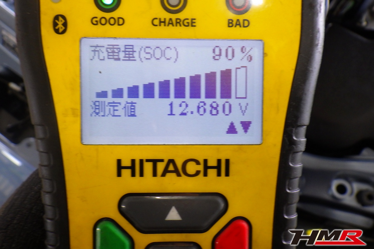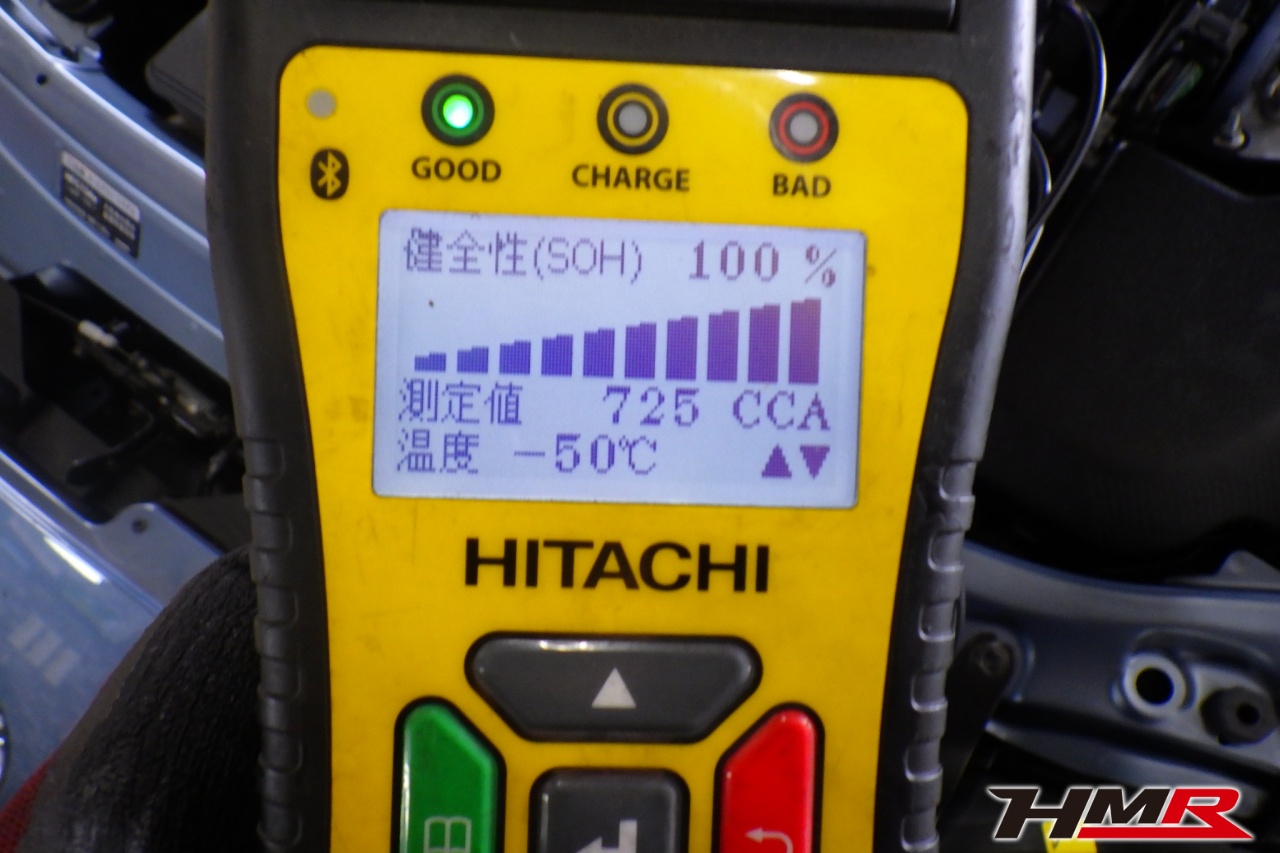 バッテリー、インテークホース、エアクリーナー、補機ベルト、プラグ、ブレーキ・クラッチマスターシリンダー、各部ゴム類の劣化、パッキン類・シール類からのオイル滲み・漏れ、ラジエターの劣化、冷却水漏れ、その他異音などをチェックしました。バッテリーが弱っていましたので交換しました。