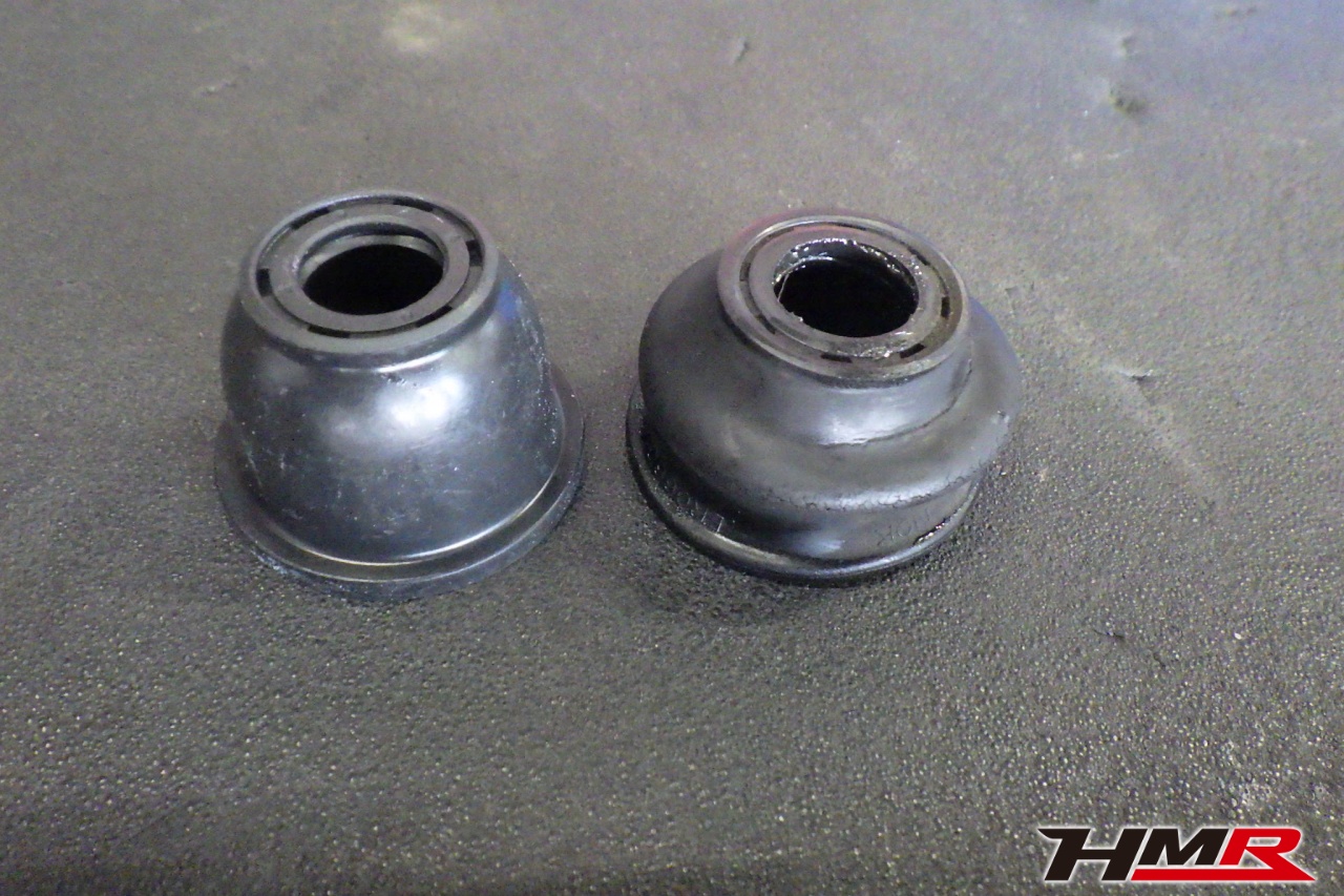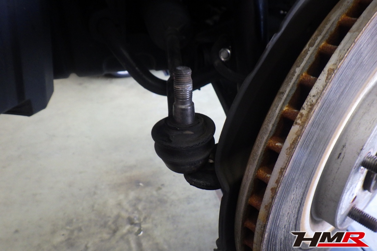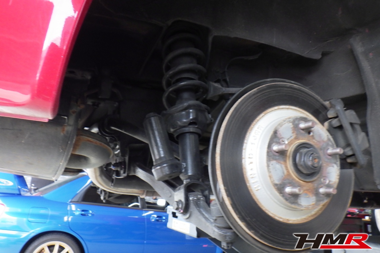 ハブベアリング・ボールジョイント、アーム・リンク類のガタ、ブッシュ・ブーツ類の劣化、エンジン・ミッション・デフからのオイル漏れと各マウント類、タイヤ溝の残量、空気圧の点検しました。左側タイロッドエンドブーツ、右側フロントスタビリンクブーツが切れていましたのでこちらも交換しました。タイヤの残り溝はフロント3.5mm・リア2.5mmでした。