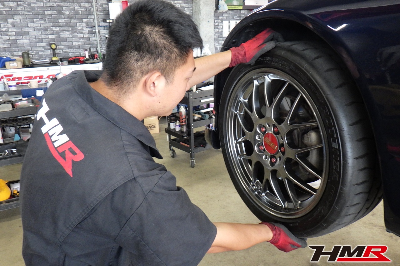 ハブベアリング・ボールジョイント、アーム・リンク類のガタ、ブッシュ・ブーツ類の劣化、エンジン・ミッション・デフからのオイル漏れと各マウント類、タイヤ溝の残量、空気圧の点検を行いました。左側フロントスタビリンクブーツが切れていましたので交換しました。タイヤの残り溝はフロント5.0mm・リア4.8mmでした。