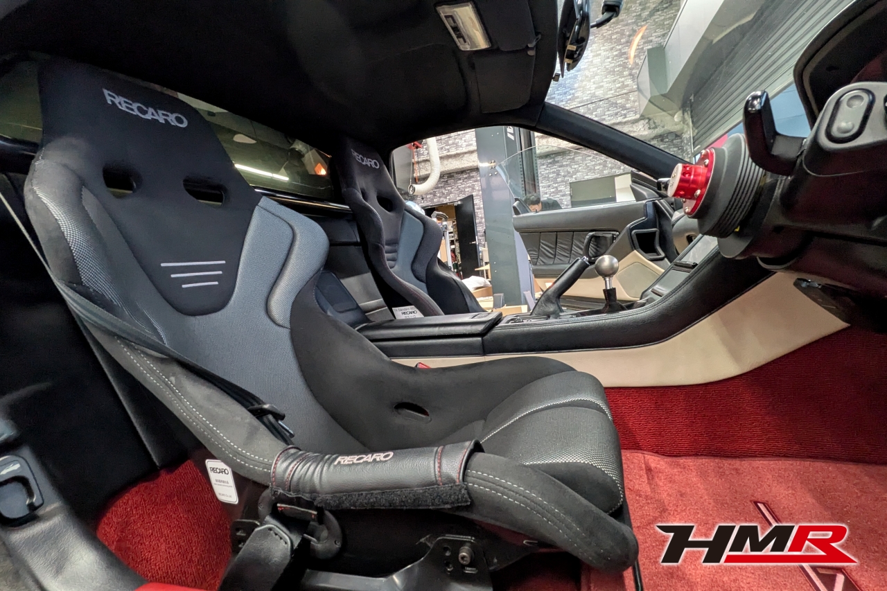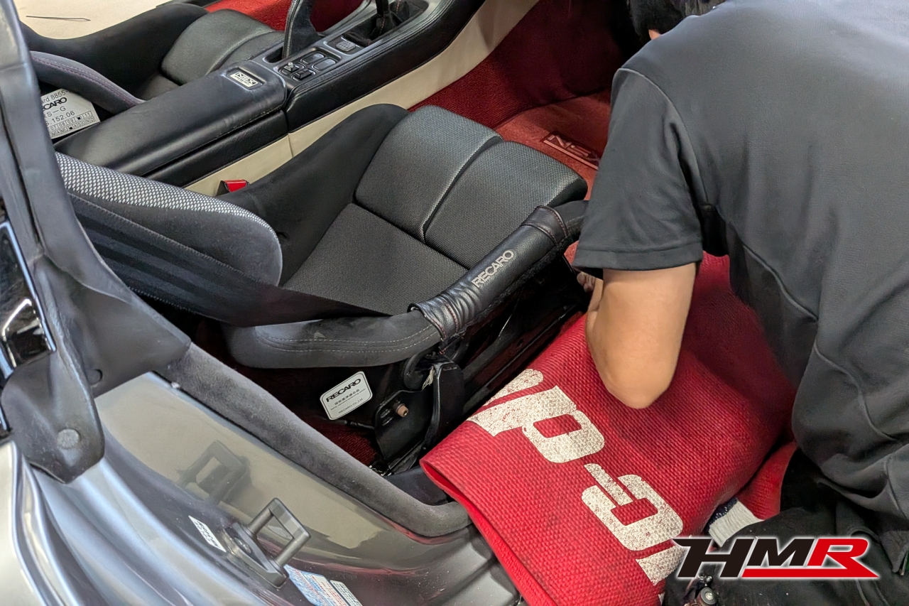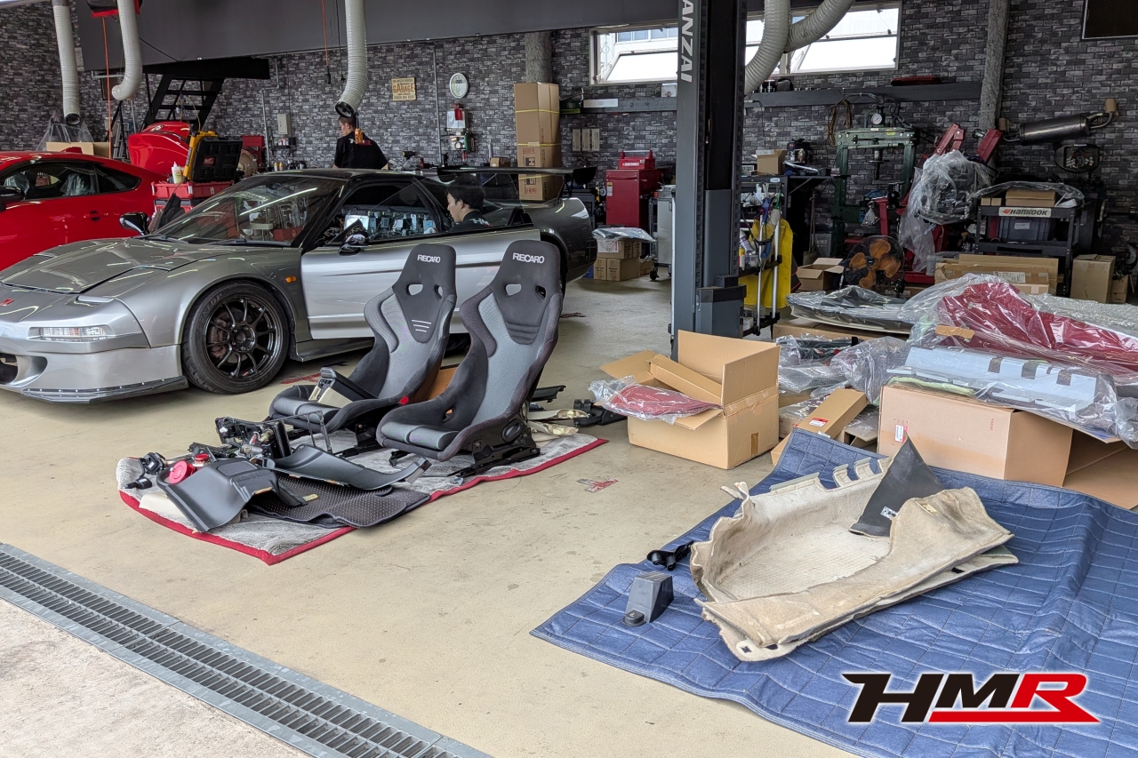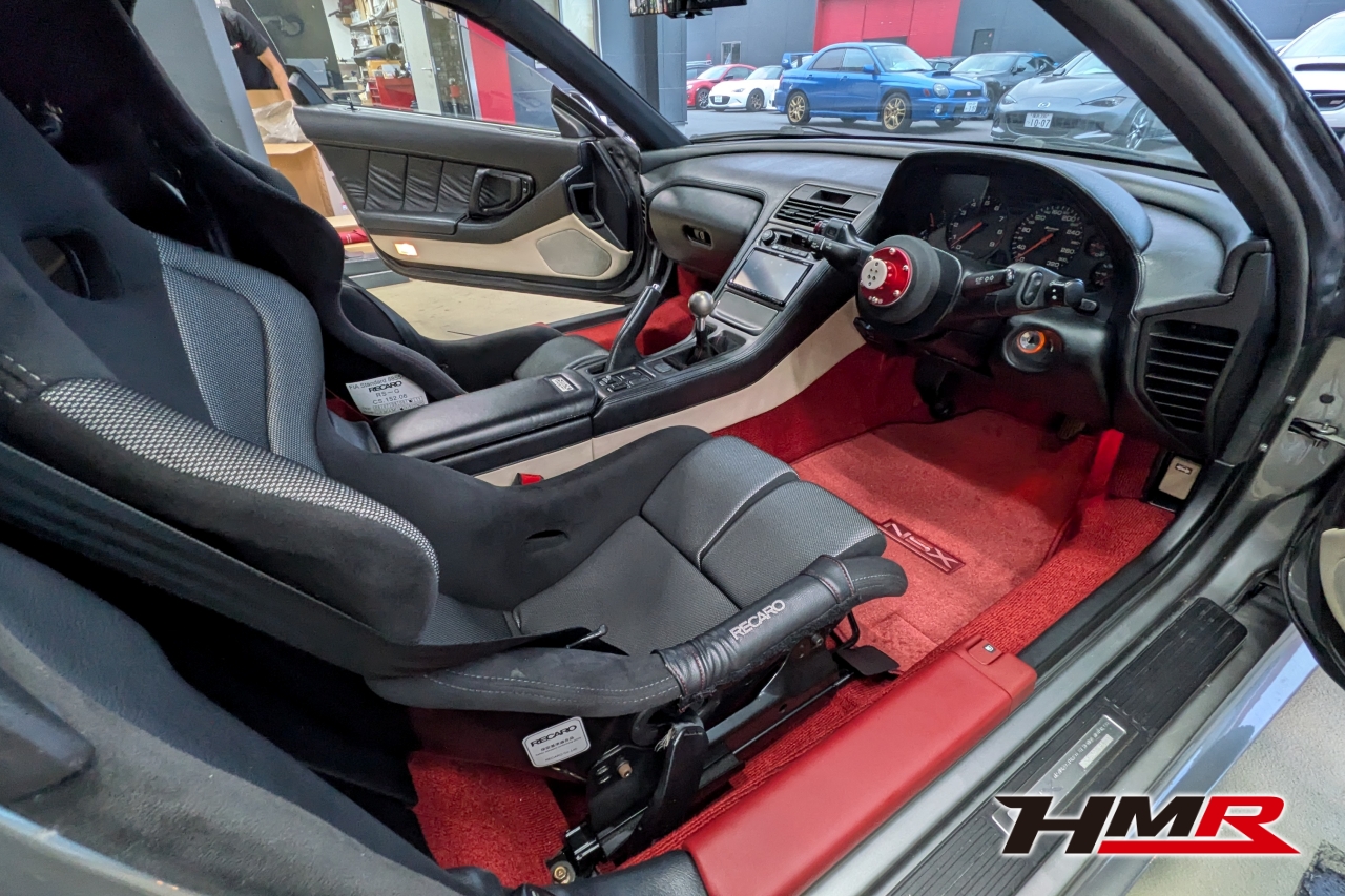 HMR(エイチエムアール)広報の小川です。今回は、久しぶりにデモカーの「NSX (NA1)」を引っ張り出してきました。このNSXは市場でも希少なホワイトレザーオプションの内装を備えており、カーペットからシート、ルーフライニングに至るまで、全てがオフホワイトで統一された仕様でした。当時としては高いオプションだったようですが…正直、この白内装がずっと気になっていたと語る社長。どうせならタイプR仕様にするかということで、パーツをコツコツと集めること数年。ある程度集まったということでタイプR用の内装パーツを組み込む作業を決行します!残念ながらタイプR用のダッシュボードは手に入らなかったので今回の作業メニューにはないです。作業はメカニックのムラマツです。