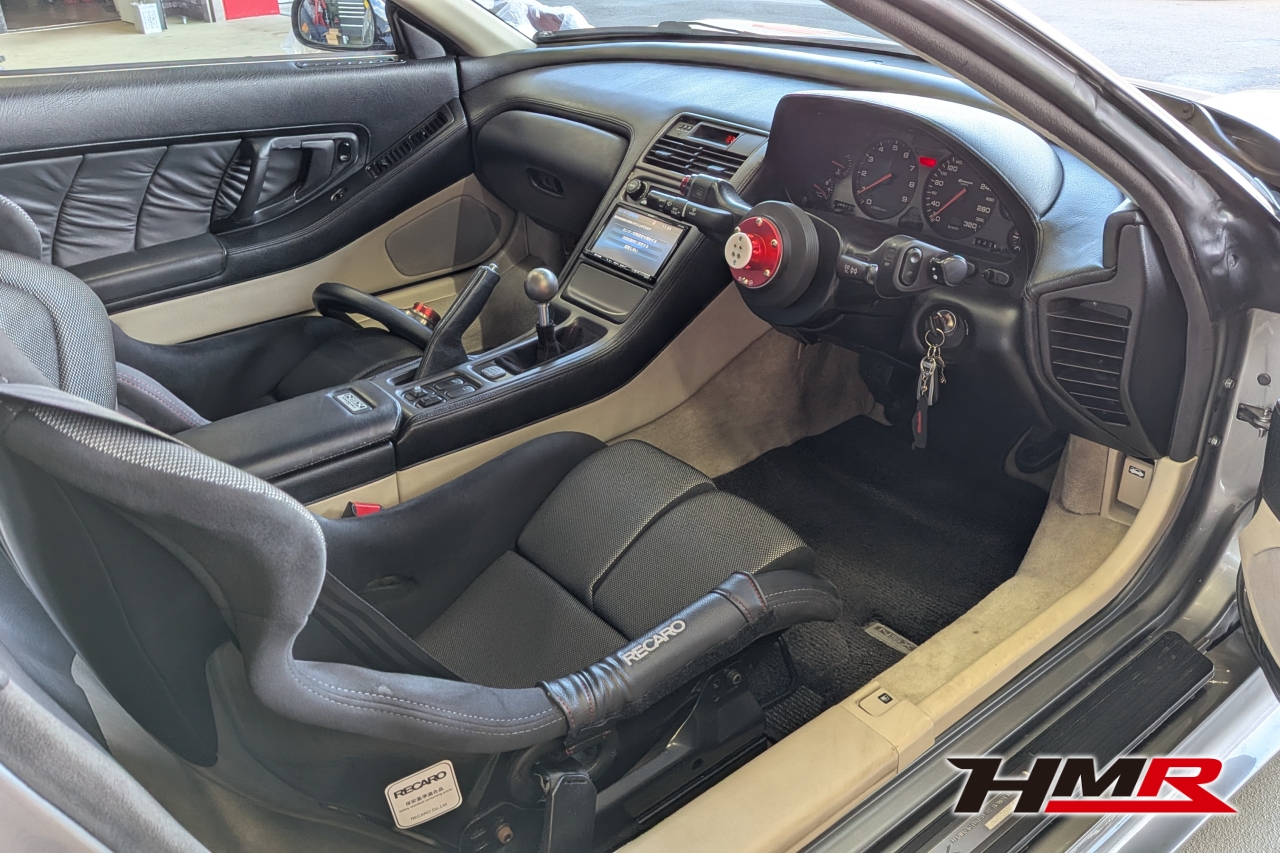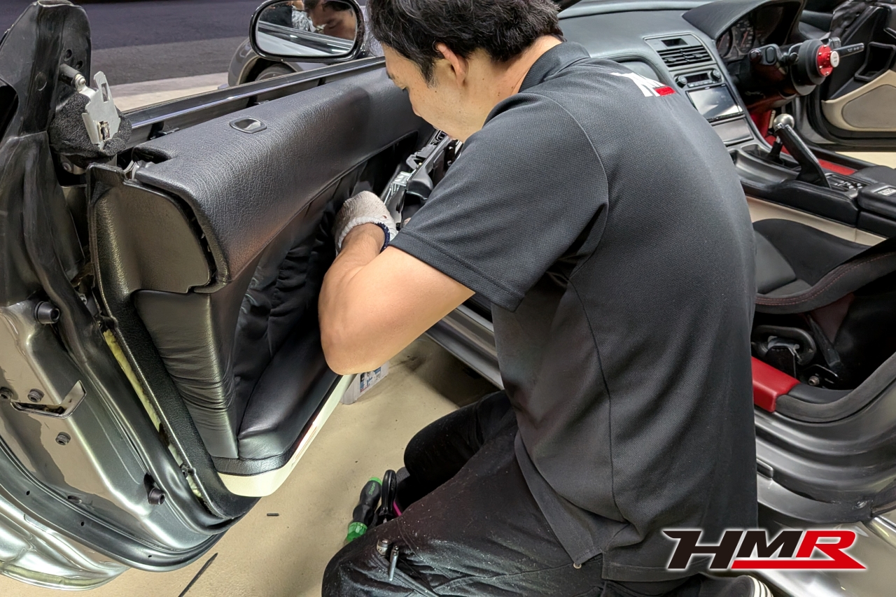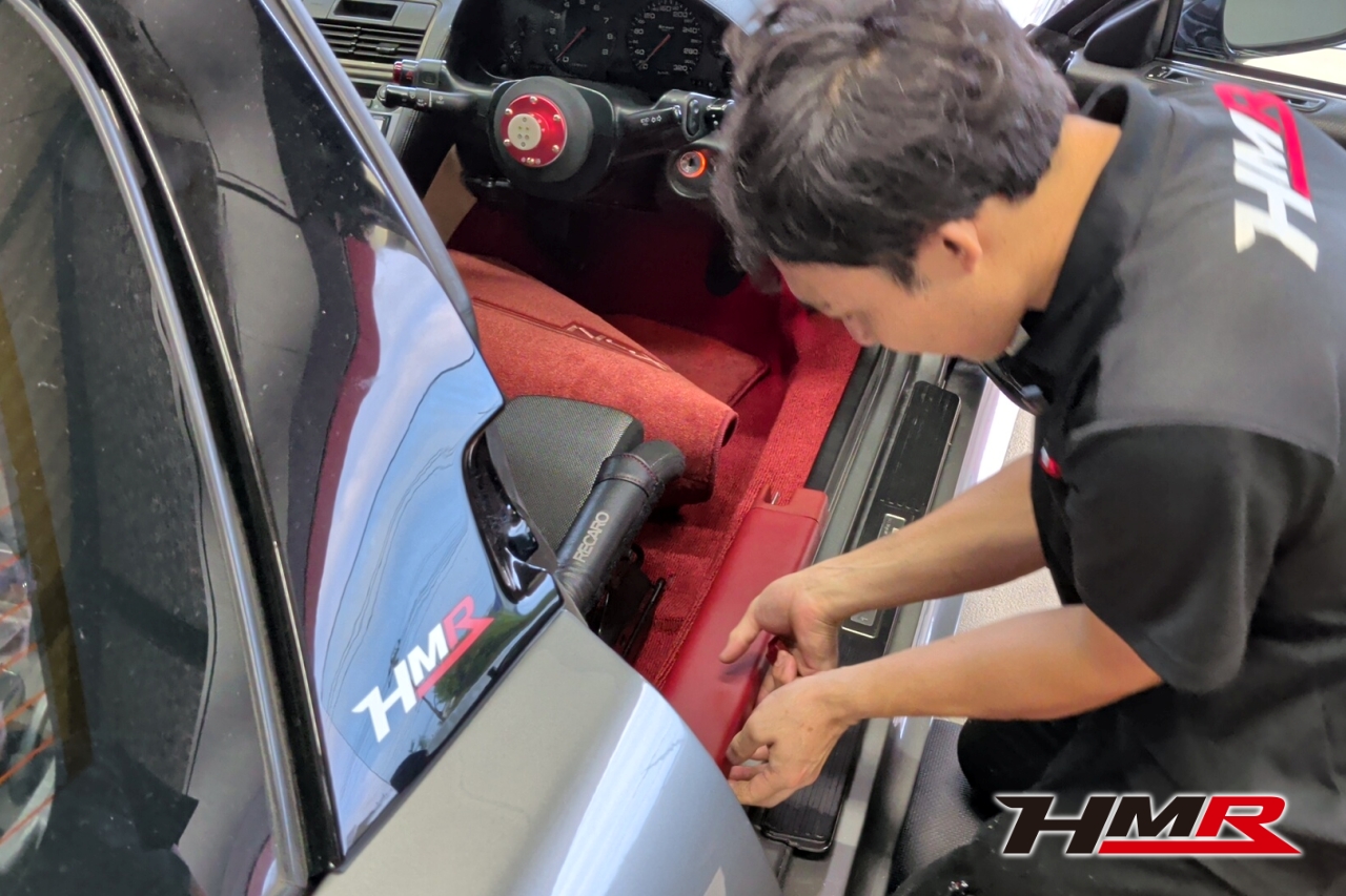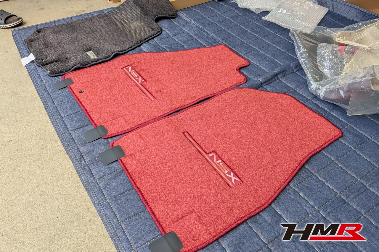 HMR(エイチエムアール)広報の小川です。今回は、久しぶりにデモカーの「NSX (NA1)」を引っ張り出してきました。このNSXは市場でも希少なホワイトレザーオプションの内装を備えており、カーペットからシート、ルーフライニングに至るまで、全てがオフホワイトで統一された仕様でした。当時としては高いオプションだったようですが…正直、この白内装がずっと気になっていたと語る社長。どうせならタイプR仕様にするかということで、パーツをコツコツと集めること数年。ある程度集まったということでタイプR用の内装パーツを組み込む作業を決行します!残念ながらタイプR用のダッシュボードは手に入らなかったので今回の作業メニューにはないです。作業はメカニックのムラマツです。