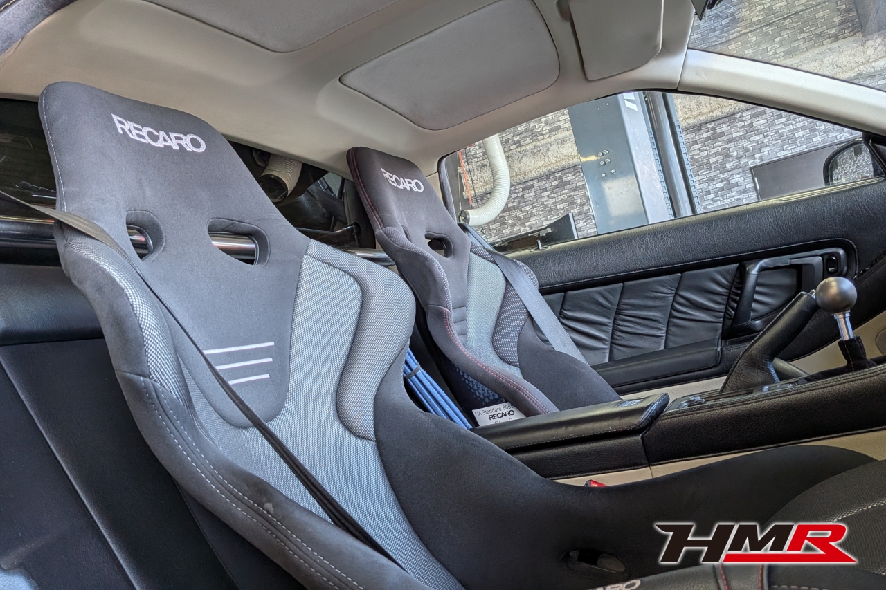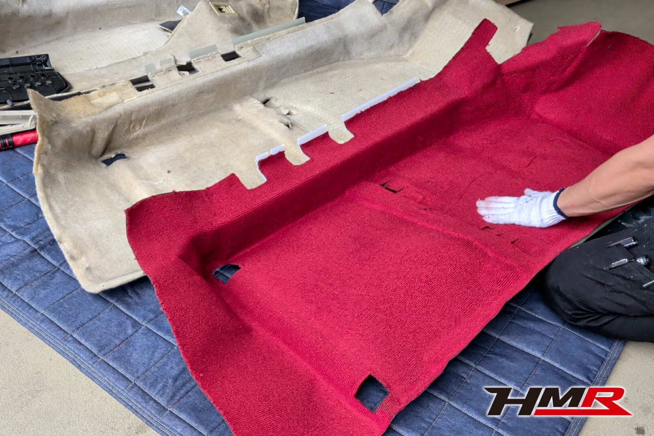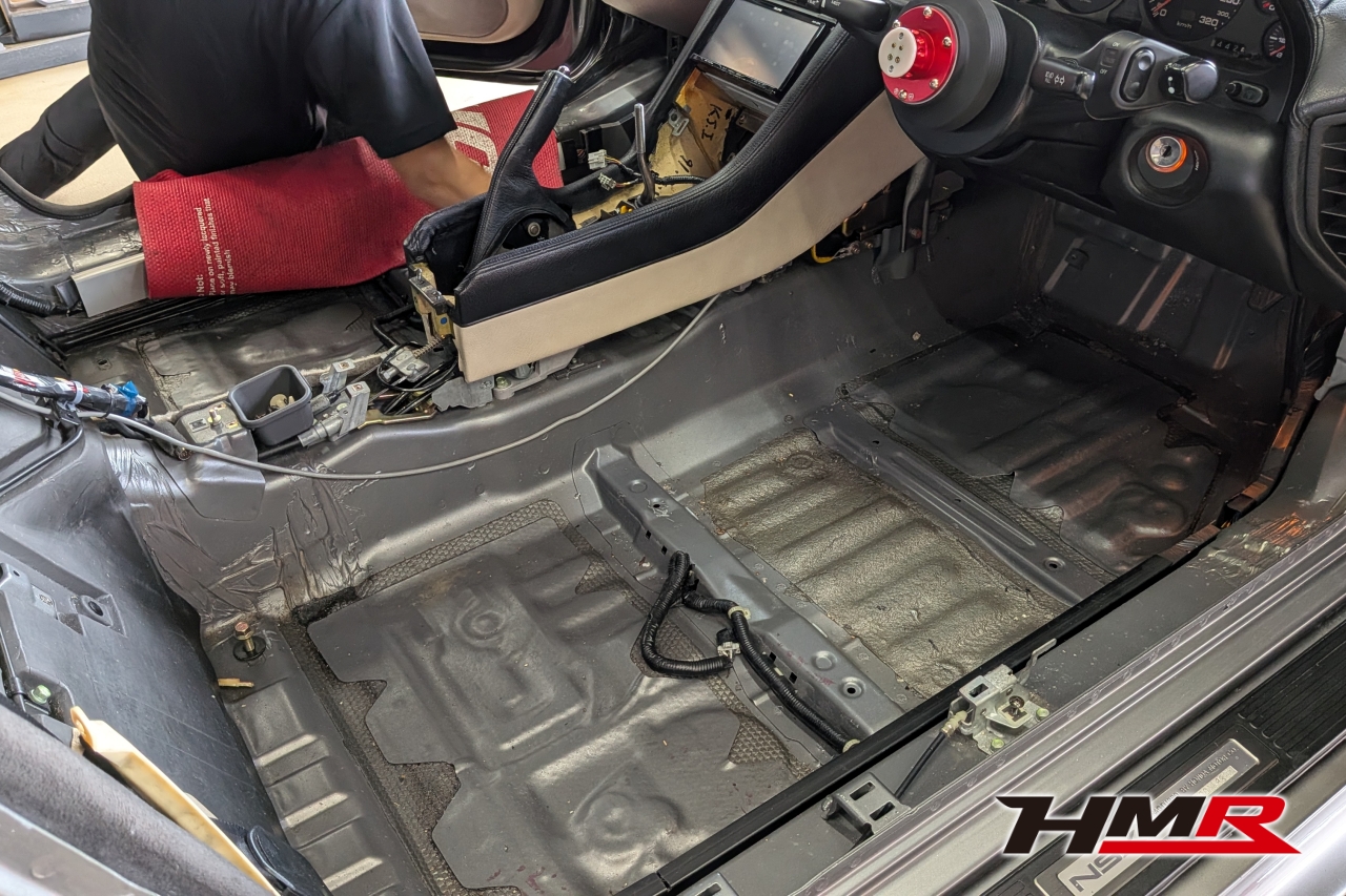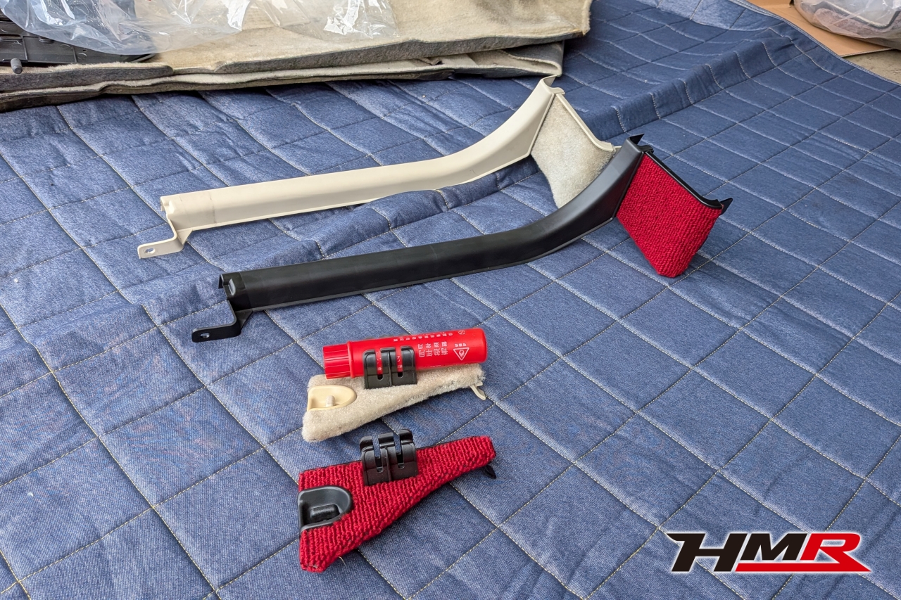 HMR(エイチエムアール)広報の小川です。今回は、久しぶりにデモカーの「NSX (NA1)」を引っ張り出してきました。このNSXは市場でも希少なホワイトレザーオプションの内装を備えており、カーペットからシート、ルーフライニングに至るまで、全てがオフホワイトで統一された仕様でした。当時としては高いオプションだったようですが…正直、この白内装がずっと気になっていたと語る社長。どうせならタイプR仕様にするかということで、パーツをコツコツと集めること数年。ある程度集まったということでタイプR用の内装パーツを組み込む作業を決行します!残念ながらタイプR用のダッシュボードは手に入らなかったので今回の作業メニューにはないです。作業はメカニックのムラマツです。