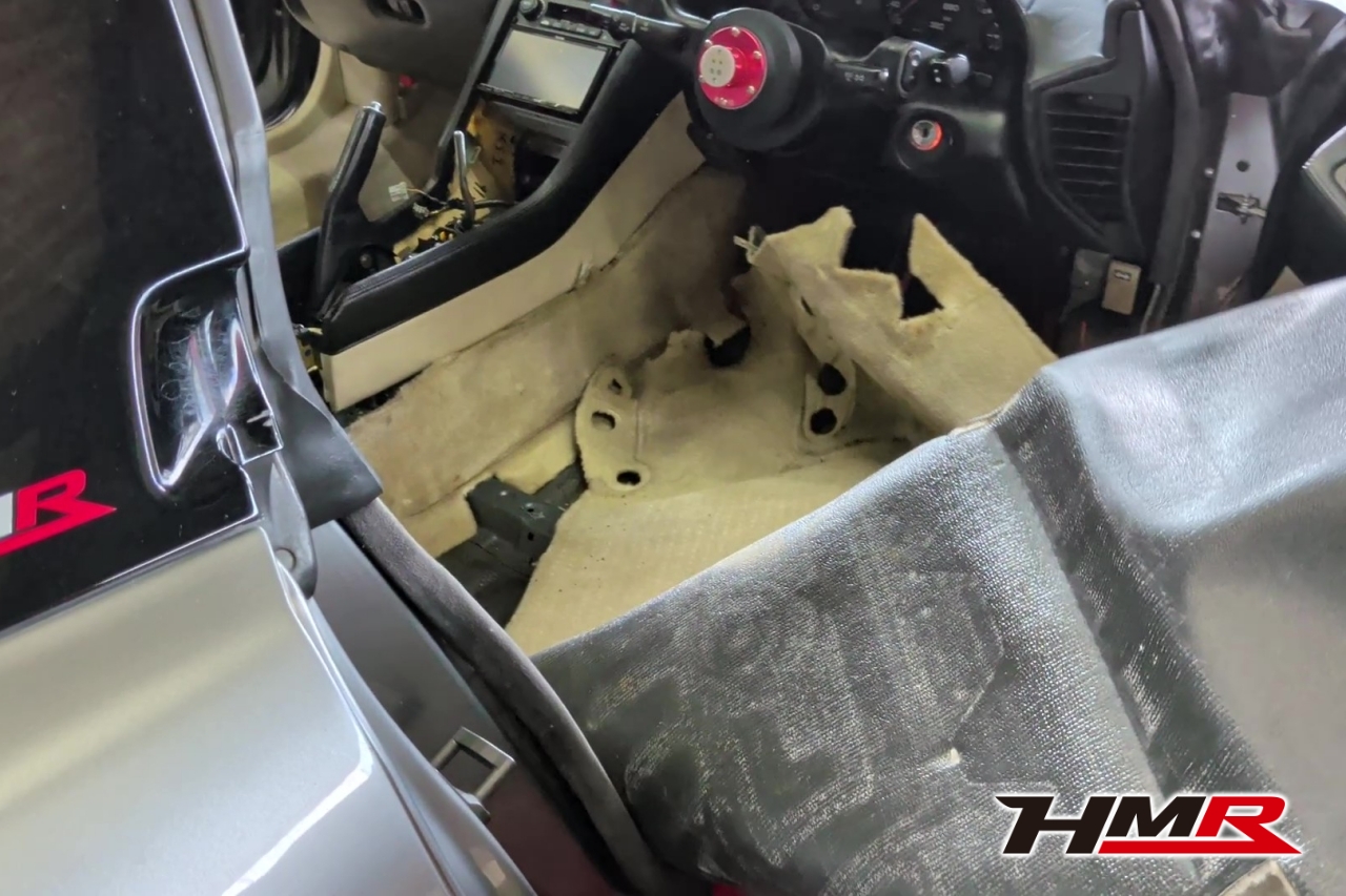 センターコンソール側の内装を外すと右側はドンガラ状態に。この内装マットはセンターコンソールの隙間に留め具がありこれを取るのに一苦労しました。