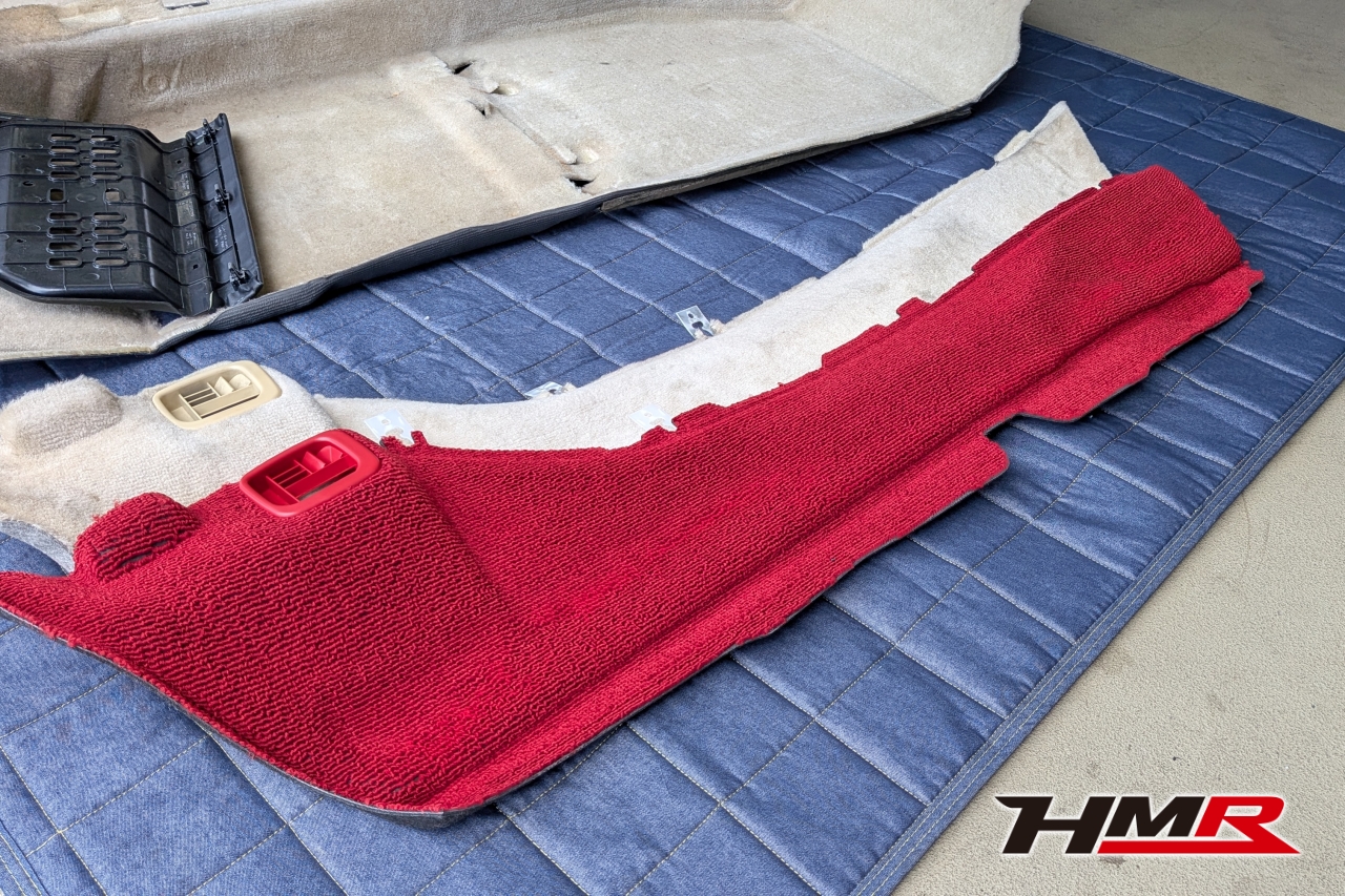 「タイプR半分化くらい」の完成度で無事(?)作業完了!ベージュに赤と黒の内装が混ざった、非常に新鮮な3トーンカラー?に仕上がりました。ドアトリムは左側がオークションで出てくるのを待ち、ボンネットレバーは新品部品を取り寄せます。センターコンソールのベージュ部分は、ダッシュボードと一体になっているので今後アルカンターラなどで貼り物をする予定です。