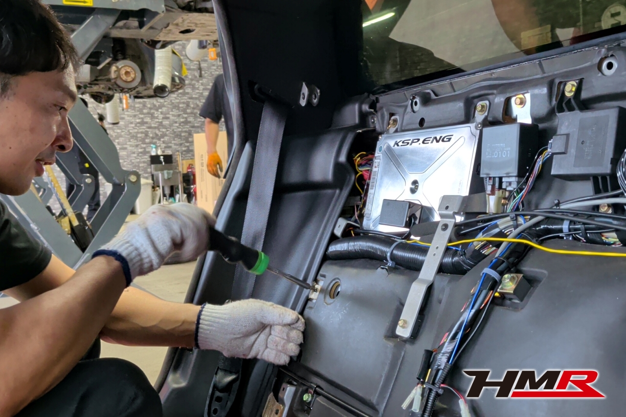 背面のパネルを外すとECUや、元々オートマだった名残のオートマコンピューターが登場。このNSXはNA2の6速ミッションに換装済みの車両です。