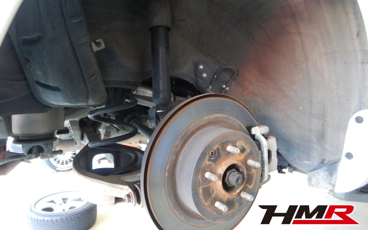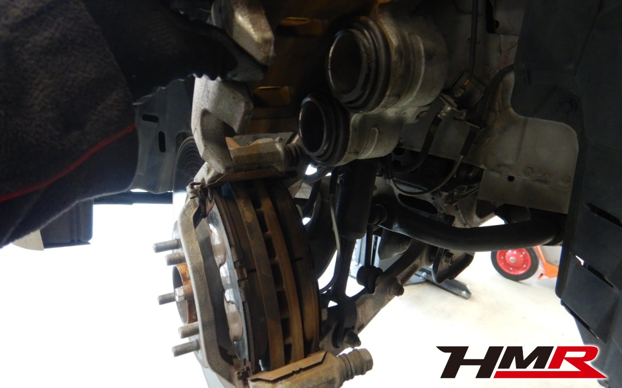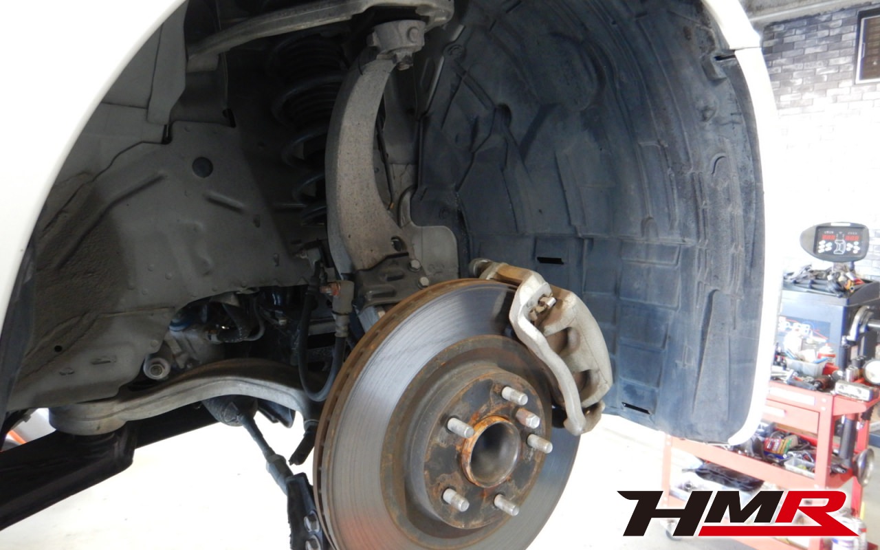 続いてリフトアップして足廻りをチェックしていきます。まず最初にタイヤを縦横に揺らしてハブベアリングとボールジョイントのガタがないかチェックを行います。特に問題ありませんでした。走行中に異音やハンドルのガタつきなどを感じた場合は当店へお早めにご相談下さい。