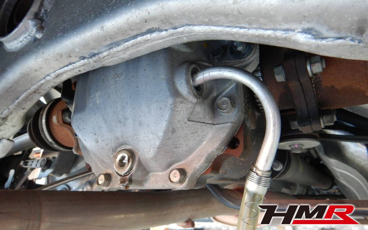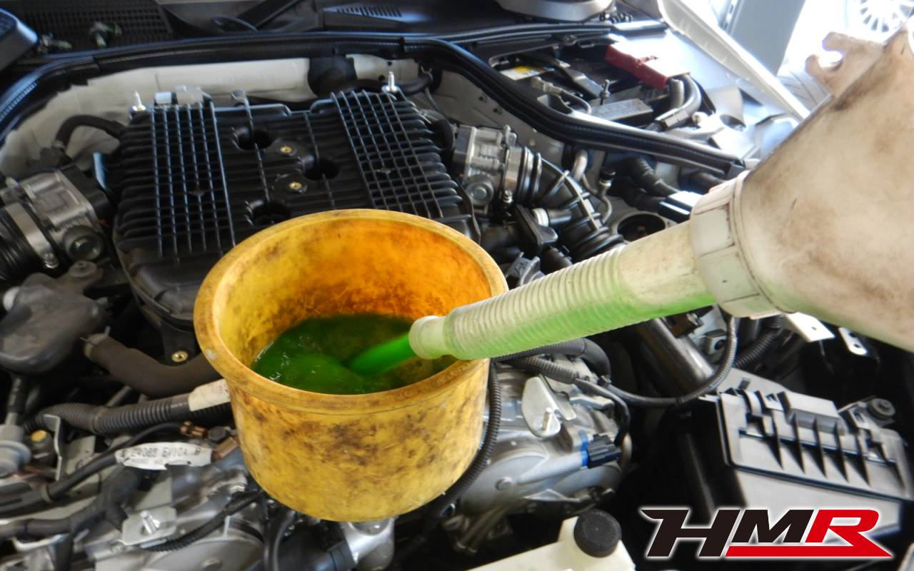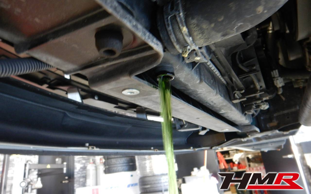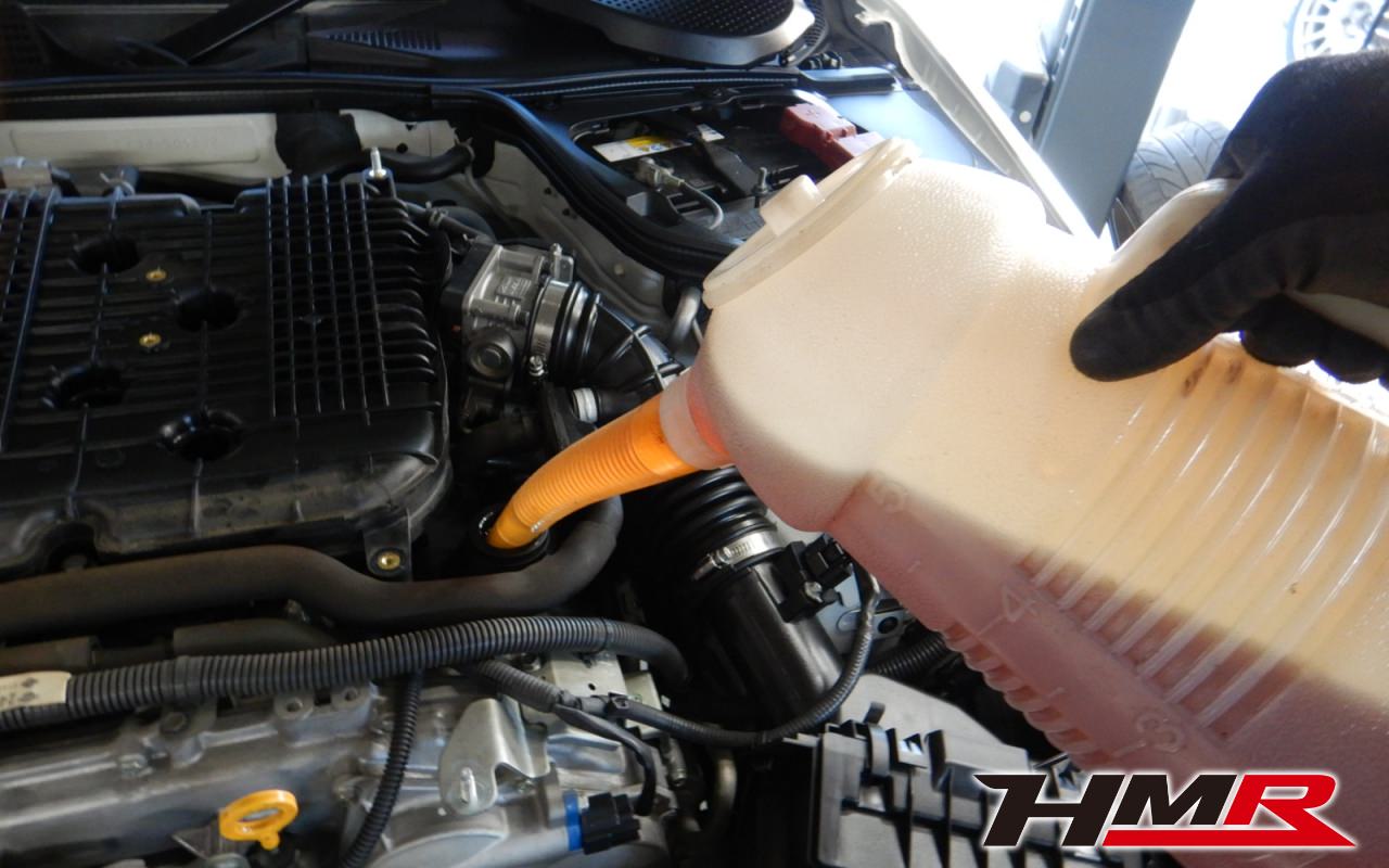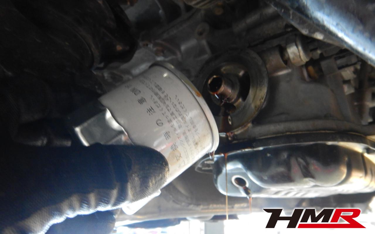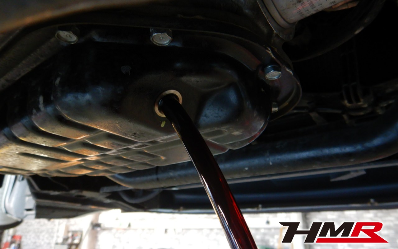 HMRではクルマに応じて、納車前点検でエンジンオイル・ブレーキフルード・ミッションオイル・デフオイル・ラジエタークーラントを新品交換しています。油脂類がリフレッシュされていれば納車してすぐのドライブも安心して楽しめますね。まずエンジンオイルから抜いていきます。エンジンオイルはエンジン内部の潤滑および冷却を行います。定期的な点検を行わず走り続けるとエンジンパワー低下、燃費悪化の原因となります。使用状況によりますが半年または5,000kmでの交換をおススメいたします。