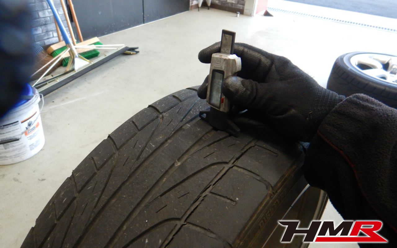 タイヤ溝の残量をチェックしていきます。フロント3mm・リア1.5mmとかなりすり減っているのでフロントタイヤ交換させていただきました。またすり減ったフロントタイヤが原因によるステアリングが右にとられる現象が起きていましたが、交換で解決しました。