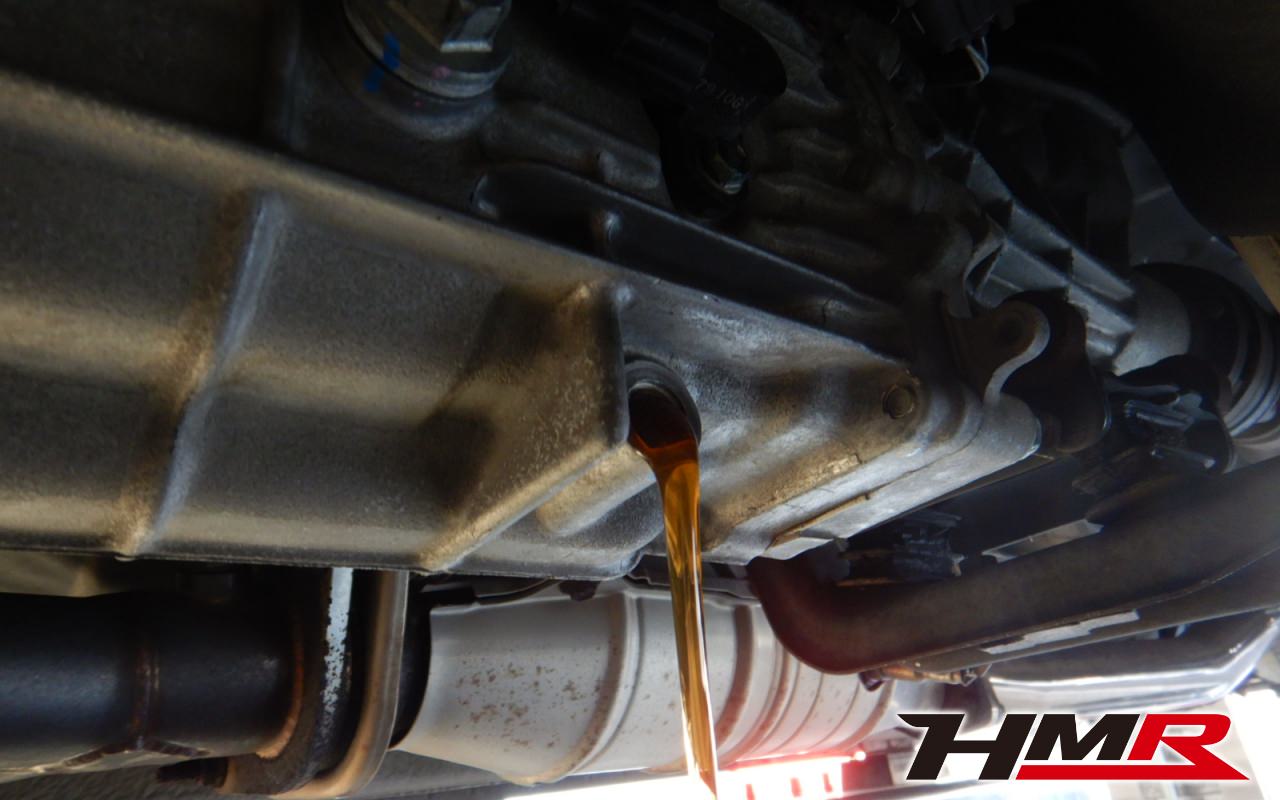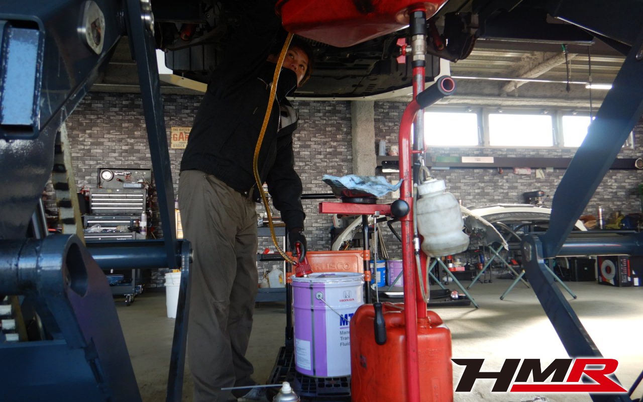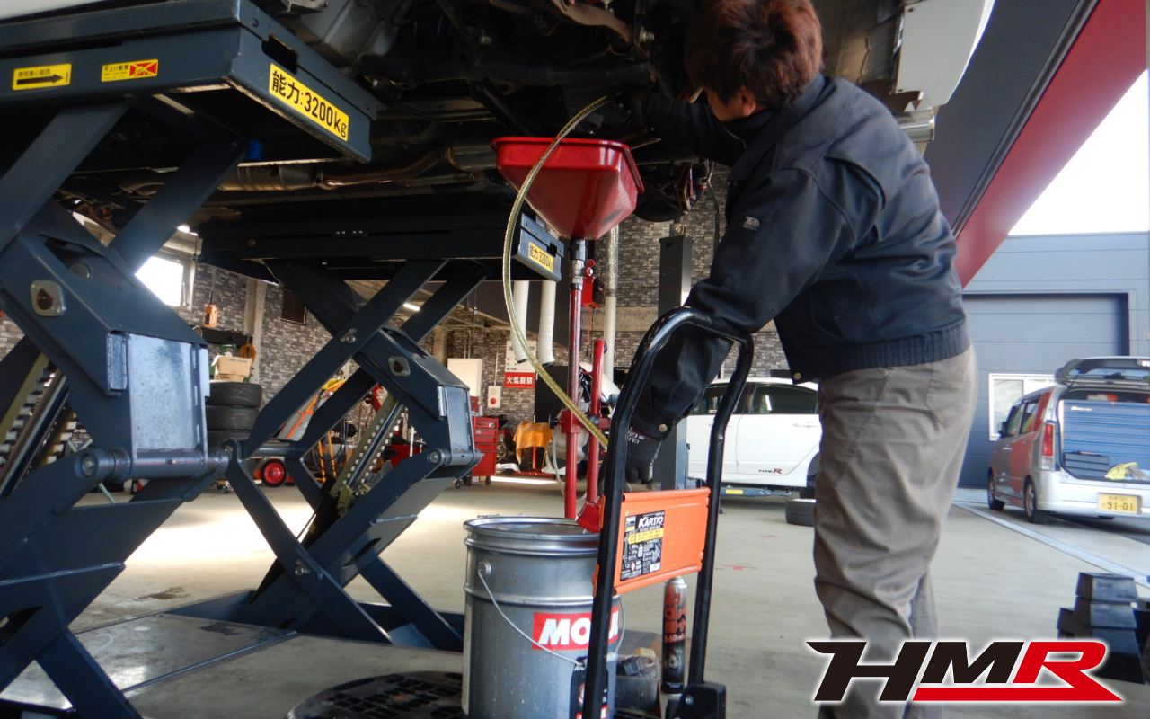 HMRではクルマに応じて、納車前点検でエンジンオイル・ブレーキフルード・ミッションオイル・ラジエタークーラントを新品交換しています。油脂類がリフレッシュされていれば納車してすぐのドライブも安心して楽しめますね。まずエンジンオイルから抜いていきます。エンジンオイルはエンジン内部の潤滑および冷却を行います。定期的な点検を行わず走り続けるとエンジンパワー低下、燃費悪化の原因となります。使用状況によりますが半年または5,000kmでの交換をおススメいたします。