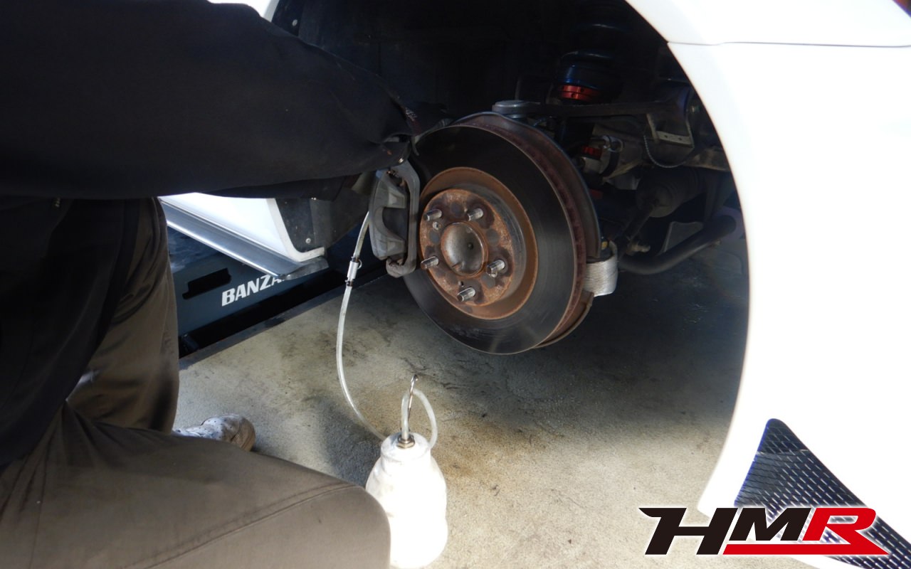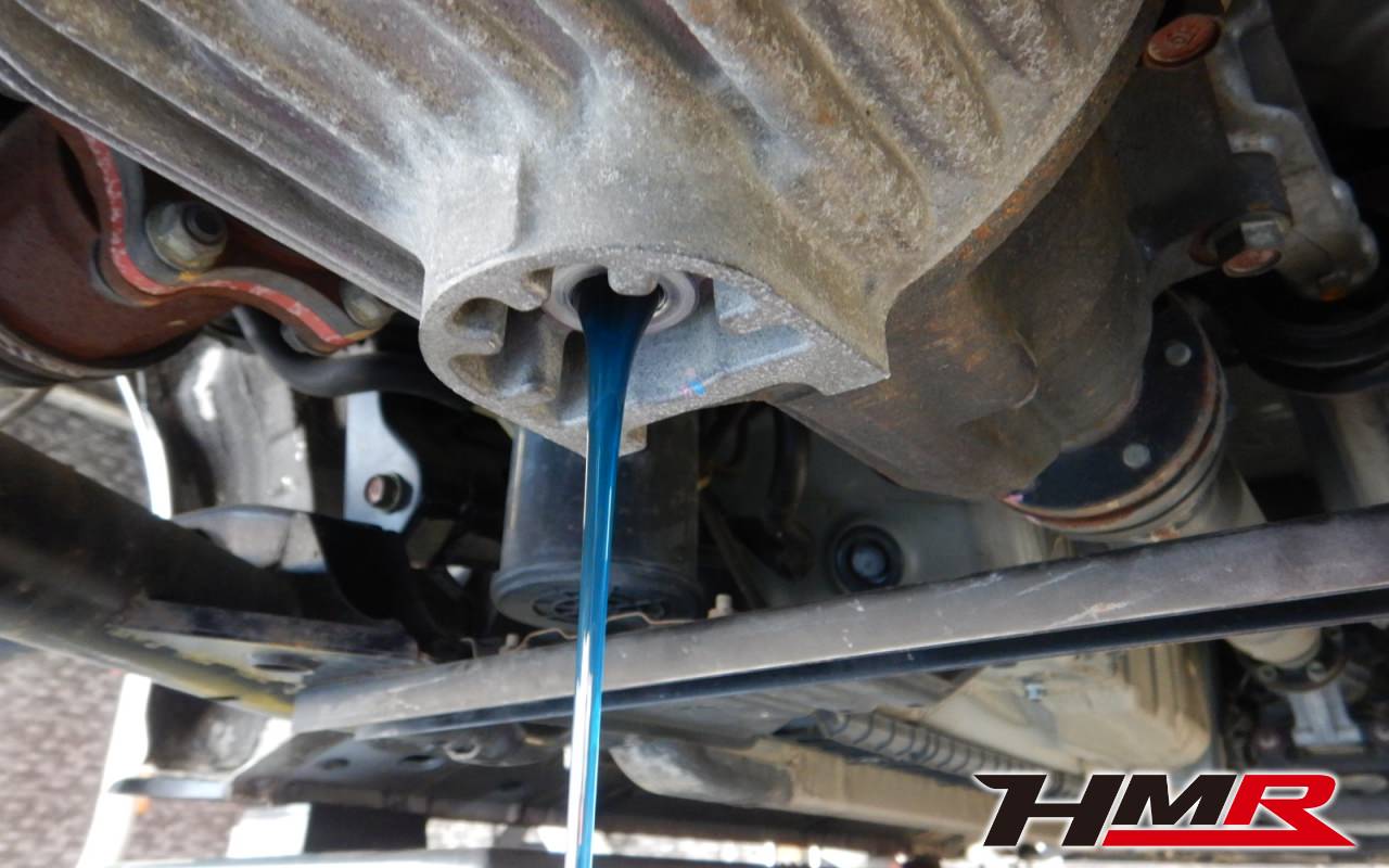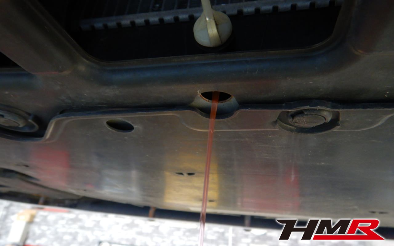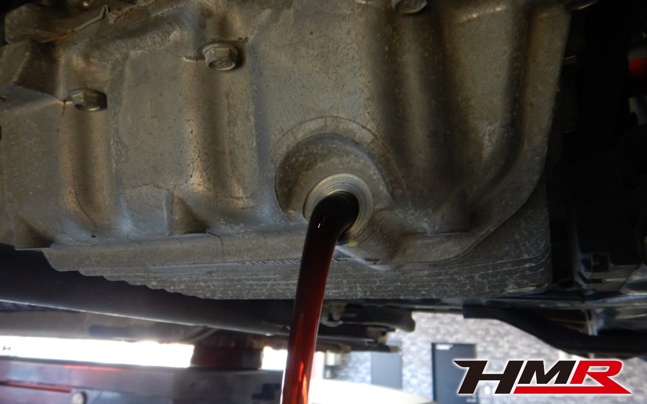 HMRではクルマに応じて、納車前点検でエンジンオイル・ブレーキフルード・ミッションオイル・ラジエタークーラントを新品交換しています。油脂類がリフレッシュされていれば納車してすぐのドライブも安心して楽しめますね。まずエンジンオイルから抜いていきます。エンジンオイルはエンジン内部の潤滑および冷却を行います。定期的な点検を行わず走り続けるとエンジンパワー低下、燃費悪化の原因となります。使用状況によりますが半年または5,000kmでの交換をおススメいたします。