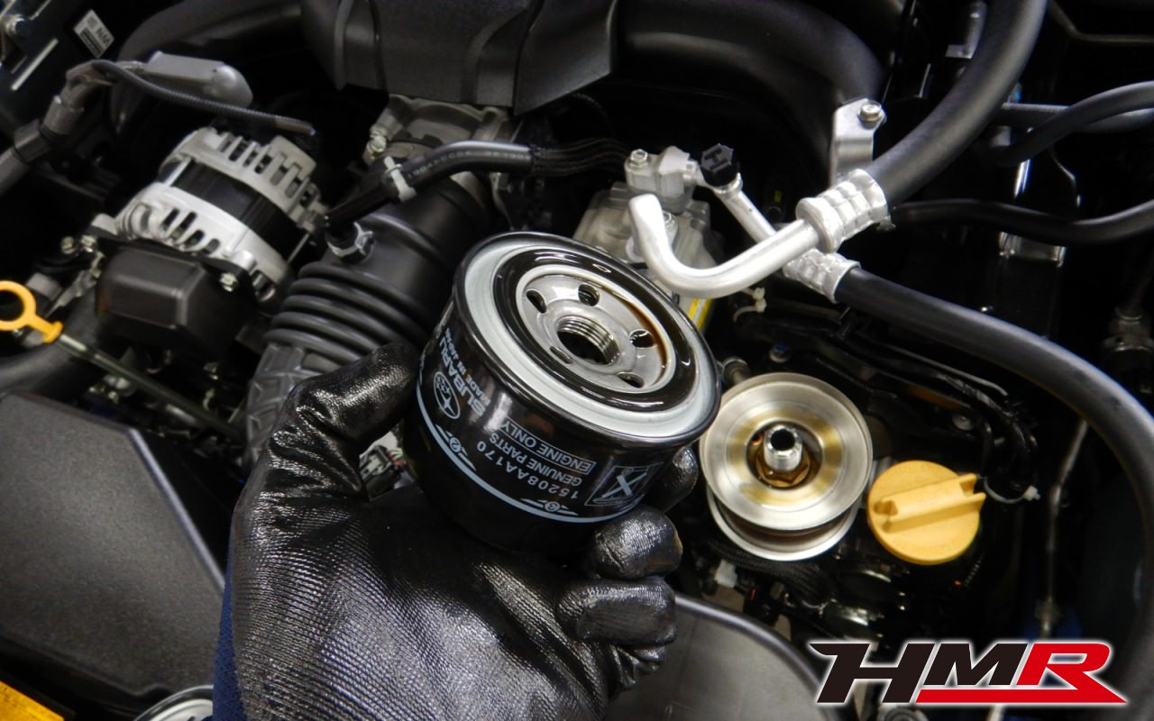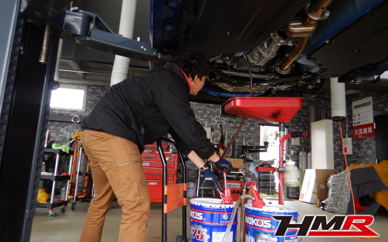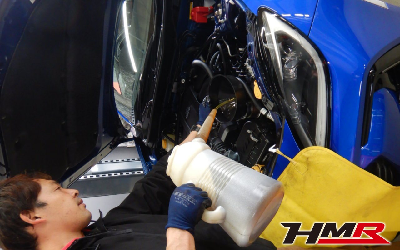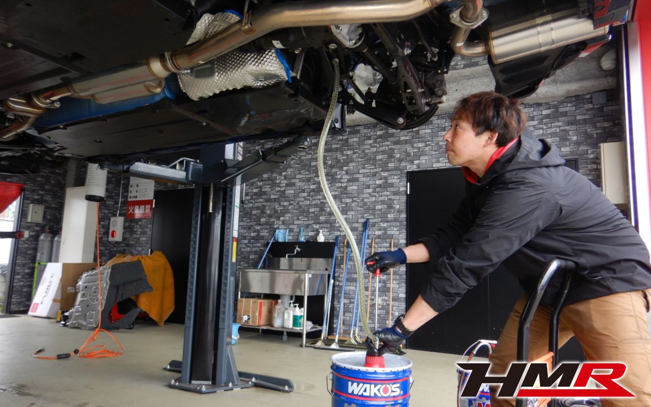 HMRでは納車前点検でエンジンオイルやブレーキフルード、ミッション(MTのみ)、デフオイルを新品交換しています。油脂類がリフレッシュされていれば納車して直ぐに楽しいドライブに行くことも出来ますね。まずはエンジンオイルから交換していきます。エンジンオイルはエンジン内部の潤滑・清掃および冷却をおこないます。定期的な交換を行わず走り続けると燃費悪化やパワーダウンからのエンジン不調などの重大な故障に繋がります。使用状況によりますが半年または5,000kmでの交換をおススメいたします。