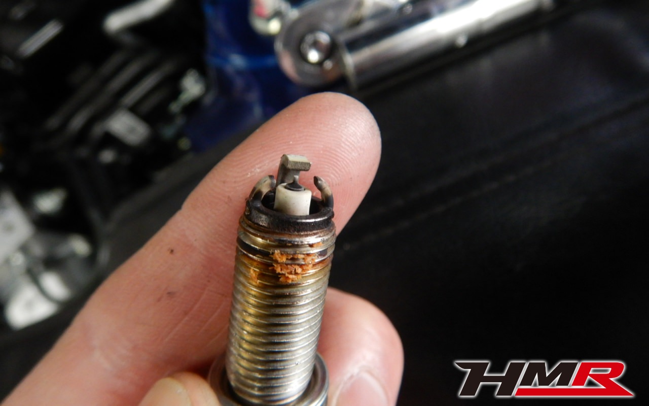 次にプラグのチェックを行いました。イリジウムプラグが装着されています。4本とも特に問題ありませんでした。イグニッションコイルと合わせて交換するとエンジン出力が戻るぐらいBRZはプラグとコイルが経年劣化します。10万kmまでにはプラグとコイルの交換おススメさせていただいております。先端の部分がひどく汚れてしまうとエンジンが掛かりづらくなったり、走行中に失火が起こり故障の原因となります。エンジンが掛かりづらくなるなどの症状が出た場合は当店にご相談ください。
