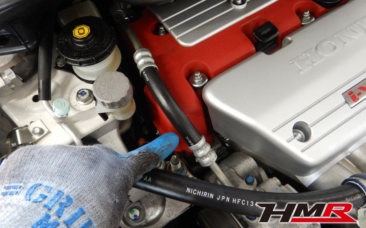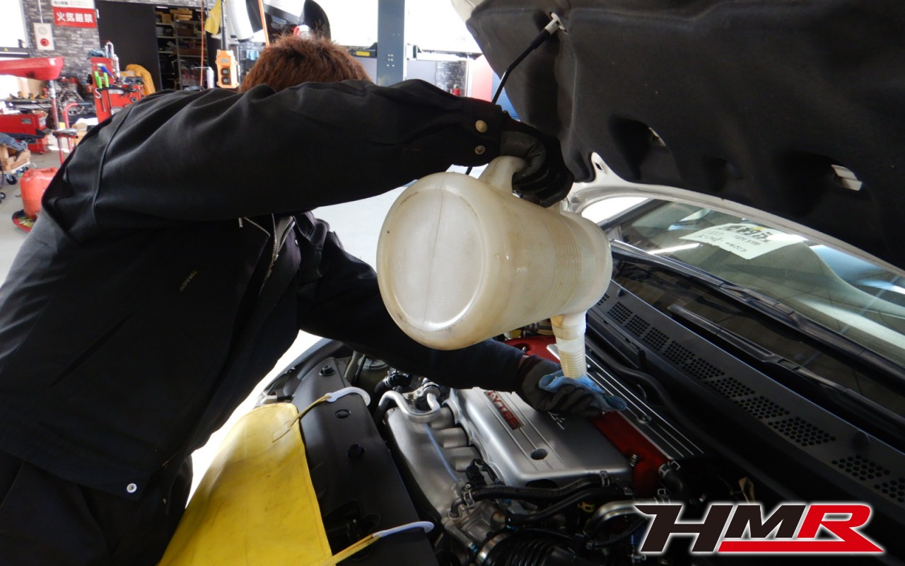 HMRではクルマに応じて、納車前点検でエンジンオイル・ブレーキフルード・ミッションオイル(MT車のみ)・ラジエタークーラント(スーパーLLCは量調整)を新品交換しています。油脂類がリフレッシュされていれば納車してすぐのドライブも安心して楽しめますね。まずエンジンオイルから抜いていきます。エンジンオイルはエンジン内部の潤滑および冷却を行います。定期的な点検を行わず走り続けるとエンジンパワー低下、燃費悪化の原因となります。使用状況によりますが半年または5,000kmでの交換をおススメいたします。ミッションオイルも抜いていきます。ミッションオイルが劣化していくとギアの入りが悪くなったり、最悪ミッションのギアを痛めてしまいミッションブローに繋がりますので定期的な交換をおススメいたします。 クーラント液も抜いていきます。 交換するミッションオイルはホンダ純正のMTF-3を使用しています。  新しいクーラント液を入れていきます。 エンジンオイルを入れていきます。エンジンオイルはWAKO’SプロステージS 100%化学合成油 10W-40を使用しています。 次にブレーキフルードを交換しました。フルードはDOT4を使用しています。交換タイミングは、車検毎をおススメしております。 サンフレアの有効期限が切れていたので交換します。サンフレアは有効期限が切れていても車載されていれば車検は問題ありません。但しいざとなった時に使えるとは限りませんのでHMRでは有効期限が切れたものは交換させていただいております。 各タイヤの空気圧チェックをしています。タイヤのエアはゆっくり少しずつ抜けていきます。ガソリンスタンドで簡単に入れられますので1ヶ月に1度のチェックをおススメいたします。  エアコンフィルターを交換しました。エアコンフィルターは取り込んだ外気に含まれるチリやゴミを受け止めてくれます。交換せずに使用を続けていくとエアコンの性能が発揮できないだけでなく、車内の不快な匂いの原因に繋がってしまいます。 リモコンキーの電池を交換しました。 以上で作業完了となります。I様、この度はシビックタイプR(FD2)ご契約ありがとうございました。ご納車まで今暫くお待ち下さい。