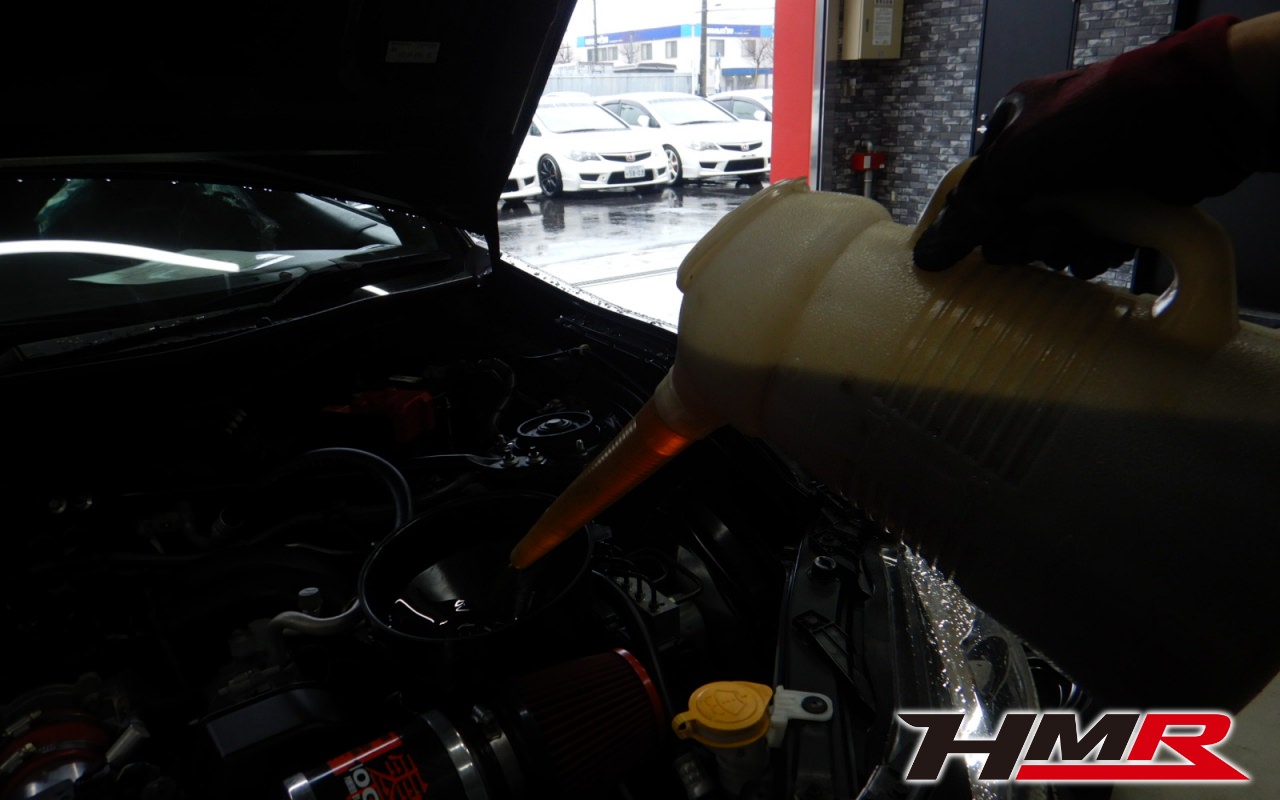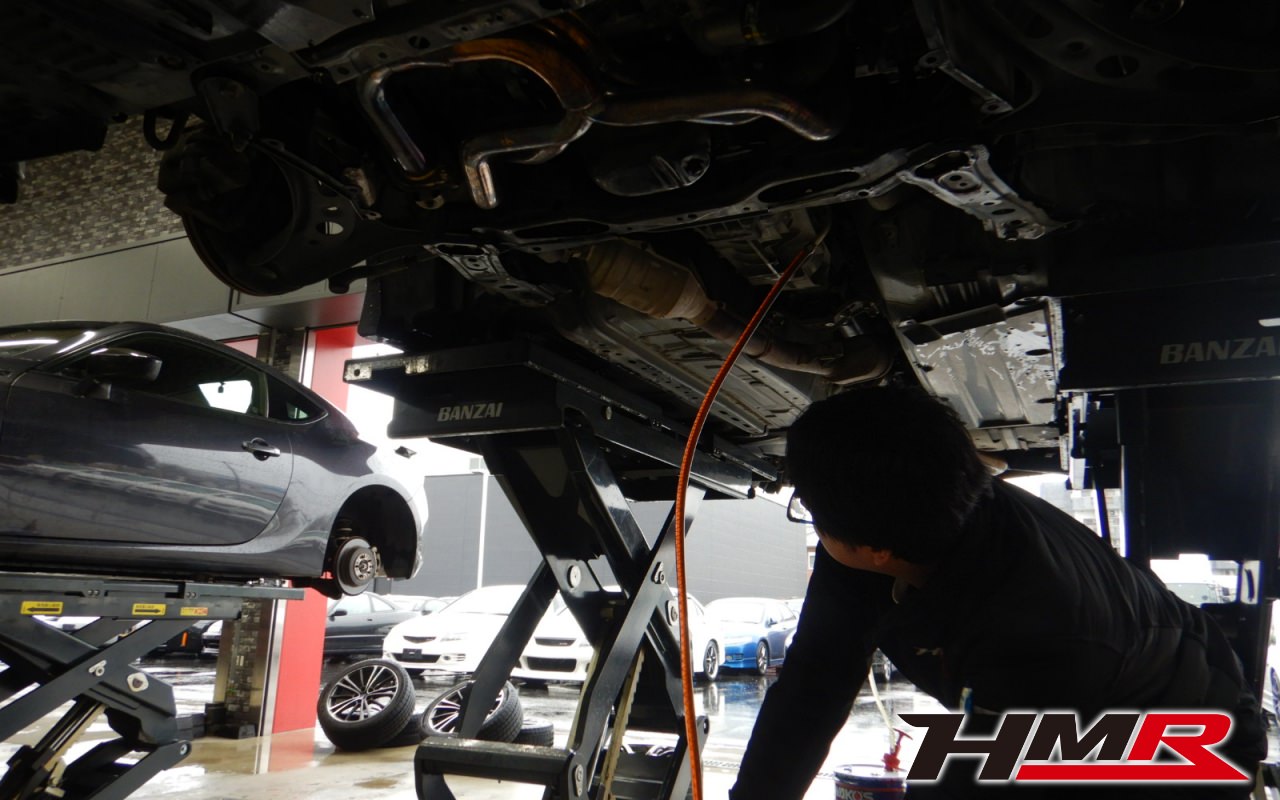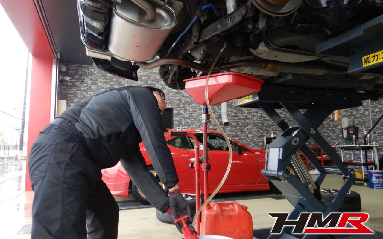 HMRでは納車前点検でエンジンオイルやブレーキフルード、ミッション(MTのみ)、デフオイルを新品交換しています。油脂類がリフレッシュされていれば納車して直ぐに楽しいドライブに行くことも出来ますね。まずはエンジンオイルから交換していきます。エンジンオイルはエンジン内部の潤滑・清掃および冷却をおこないます。定期的な交換を行わず走り続けると燃費悪化やパワーダウンからのエンジン不調などの重大な故障に繋がります。使用状況によりますが半年または5,000kmでの交換をおススメいたします。クーラント液も抜いていきます。 ミッションオイルも抜いていきます。ミッションオイルが劣化していくとギアの入りが悪くなったり、最悪ミッションのギアを痛めてしまいミッションブローに繋がります。定期的な点検と早めの交換をおススメします。  リアデフオイルも抜いていきます。 デフオイルはWAKO’S ギアオイルMG-90を入れていきます。 ミッションオイルもWAKO’S ギアオイルMT-75 75W-90を入れていきます。  新しいエンジンオイルはWAKO’S プロステージS 0W-30 100%化学合成油を使用します。 ブレーキフルードを交換して同時にエア抜きを行います。ブレーキフルードはDOT4を使用しています。こちらは使用状況によりますが車検毎の交換をおススメいたします。 タイヤ溝のチェックをしました。フロントが4.5mmありましたが、リアタイヤがスリップサインが出ていましたのでお早めの交換をおススメさせていただきました各タイヤの空気圧チェックをしています。タイヤのエアはゆっくり少しずつ抜けていきます。ガソリンスタンドで簡単に入れられますので1ヶ月に1度のチェックをおススメいたします。 お客様が別途ご購入されたHKSマフラーを装着しました。ピカピカでマフラーエンドの焼けがカッコいいですね♪現在のマフラーは「JQR(旧JASMA)認証」を受けています。この認証は近接排気騒音の試験に加えて加速走行騒音の試験を行います。基準以下であれば製品に認証プレートが装着され、車検通過できますが内部構造の経年劣化が進んでいくと基準値を超えて車検不通過になる可能性があります。中古品の場合はそういったケースも考えられますのでマフラー交換を検討されているのであればご相談ください。  室内灯の点灯不良が起こっていましたのでスイッチを交換しました。作業は以上となります。N様、この度は86(ZN6)ご契約いただきありがとうございました。現代のFRスポーツの走りを存分に楽しんでください。